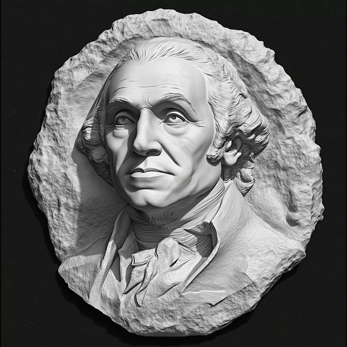 This is a highly detailed 3D bas-relief of George Washington, the first President of the United States and a key figure in American history. The model captures his iconic likeness with artistic precision, making it ideal for patriotic artwork, commemorative plaques, wall decor, coins, or collector’s items.