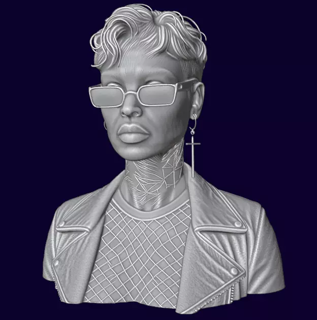 This highly detailed 3D model features a stylized bust of a person with sunglasses and a cross earring, perfect for use as a decorative sculpture or collectible. The model has intricate textures, including a leather jacket and mesh top, making it suitable for high-quality 3D printing. It is designed to be printed at a size of 30mm, capturing all fine details for an exceptional finished piece.