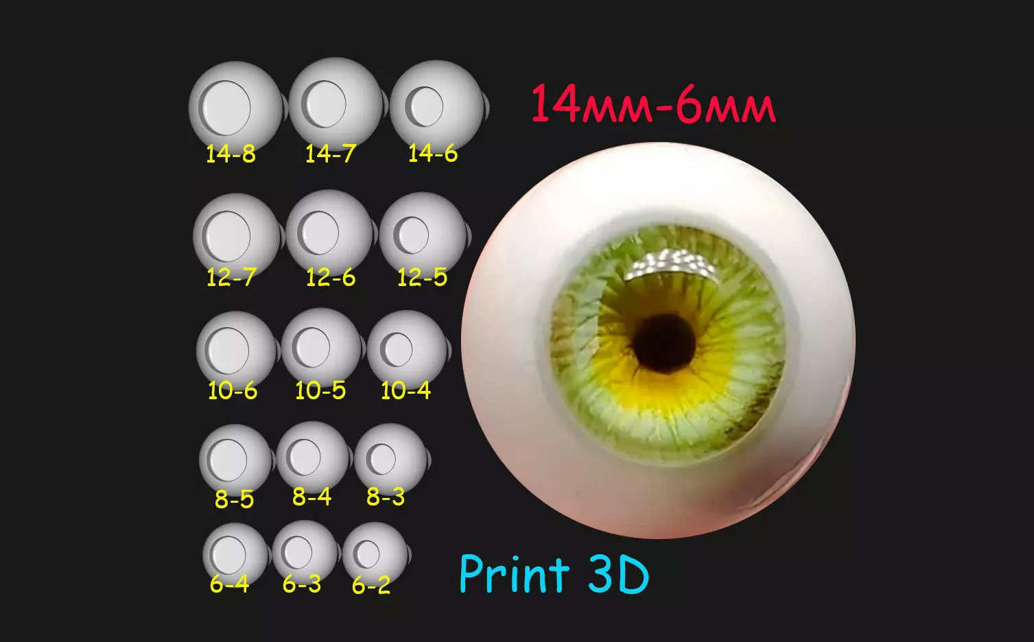 3D Printed Eyes for BJD Dolls Various Sizes from 6-14mm 3D print model