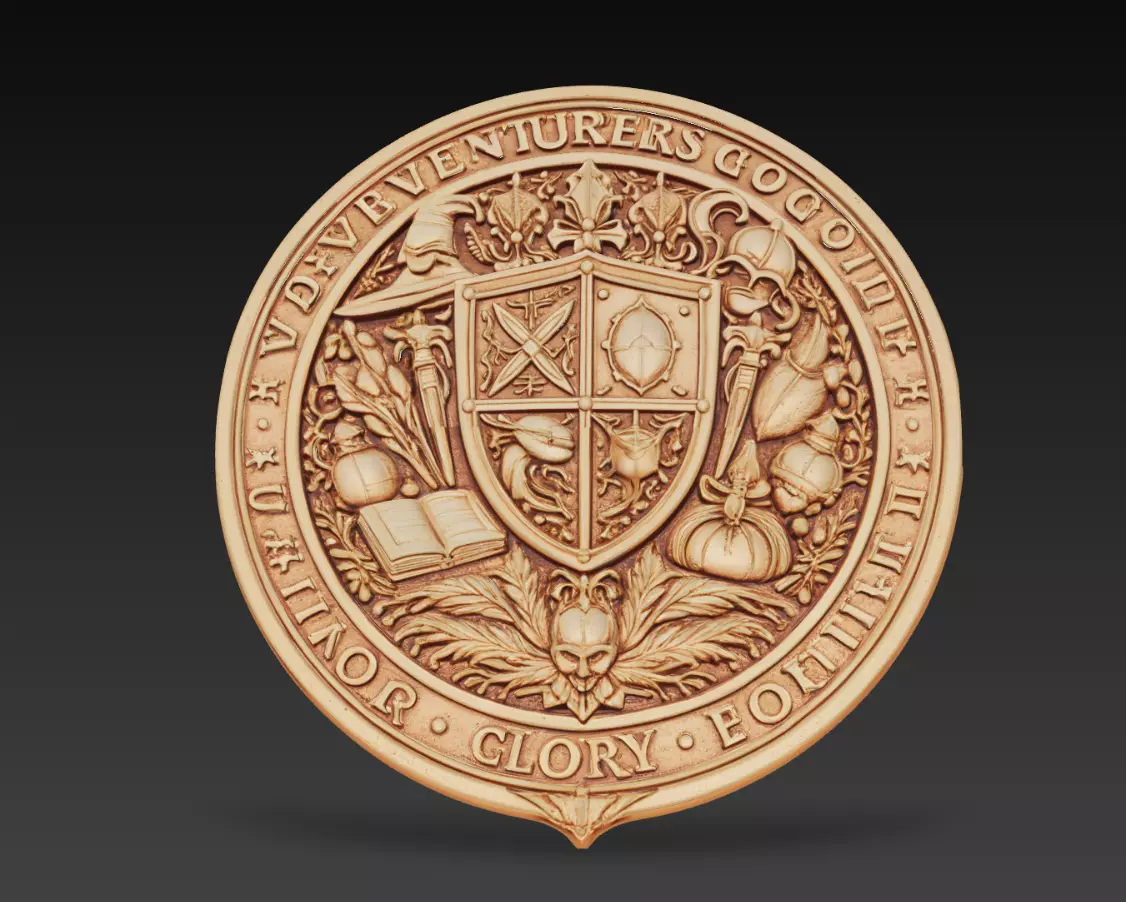 This Adventurer Guild Crest 3D Model presents a richly detailed fantasy composition designed as a high-relief circular coin.