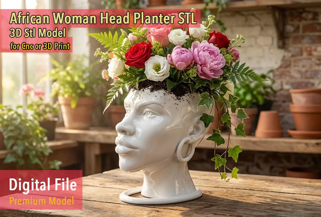 Elevate your home or office decor with this stunningly stylized African Woman Head Planter. This 3D printable model combines contemporary art with functionality, featuring a beautiful female bust with elegant features and traditional hoop earrings. Designed specifically for plant lovers and interior decor enthusiasts, it serves as a perfect home for succulents, air plants, or small indoor greenery.