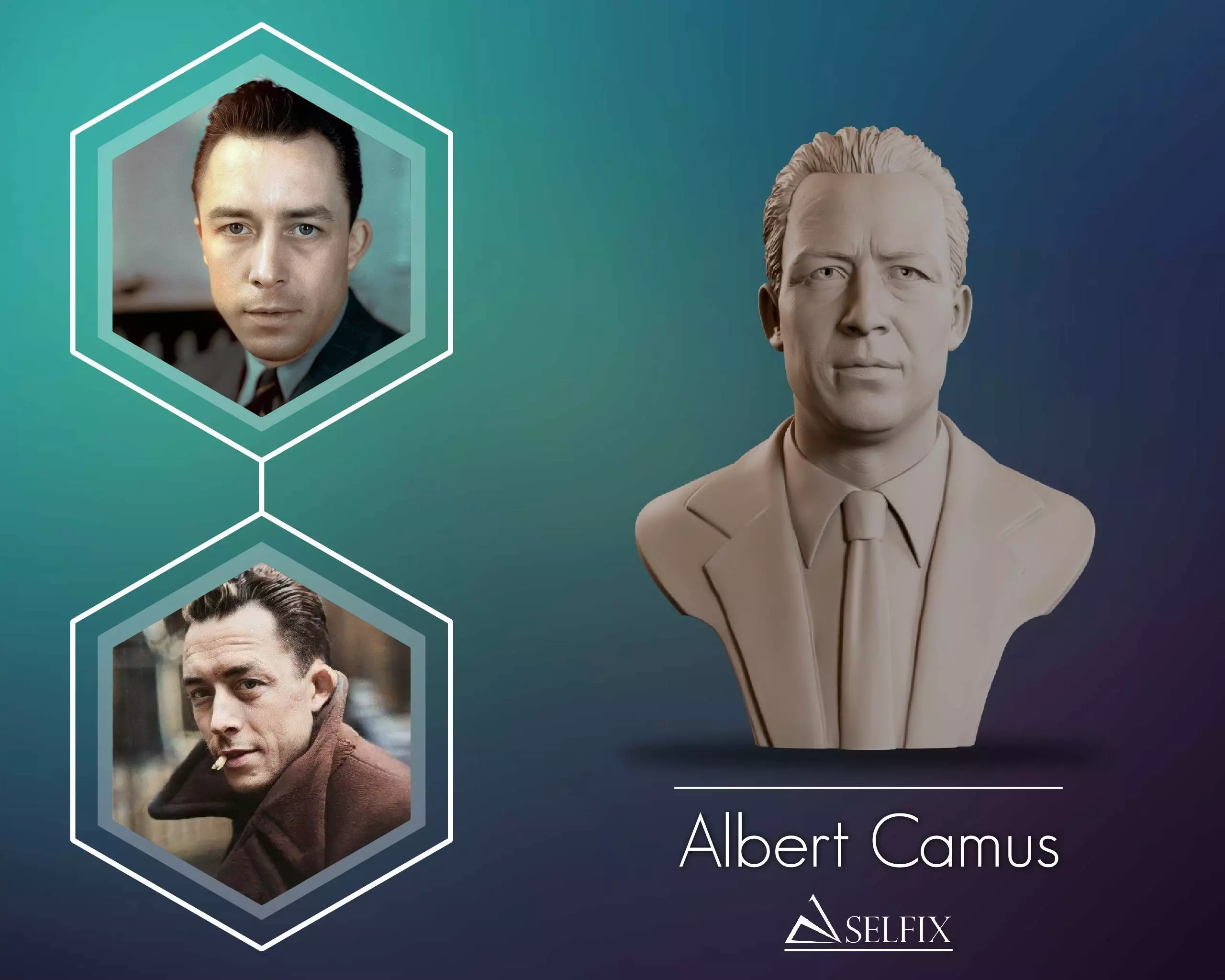 3D printable bust file of Albert Camus, capturing the Nobel-winning philosopher's intense gaze. This model authentically recreates his tousled hair, cigarette-ready lips, and existential frown that made him an icon of 20th century thought. Ready for immediate download and printing at any size.