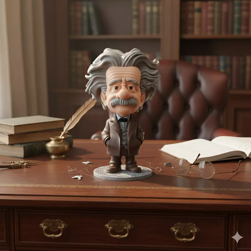 Design ConceptThis 3D model portrays a chibi-style rendition of Albert Einstein, highlighting whimsy and charm with exaggerated features such as a larger head and distinctive wild hair design while maintaining the iconic elements associated with the renowned physicist.