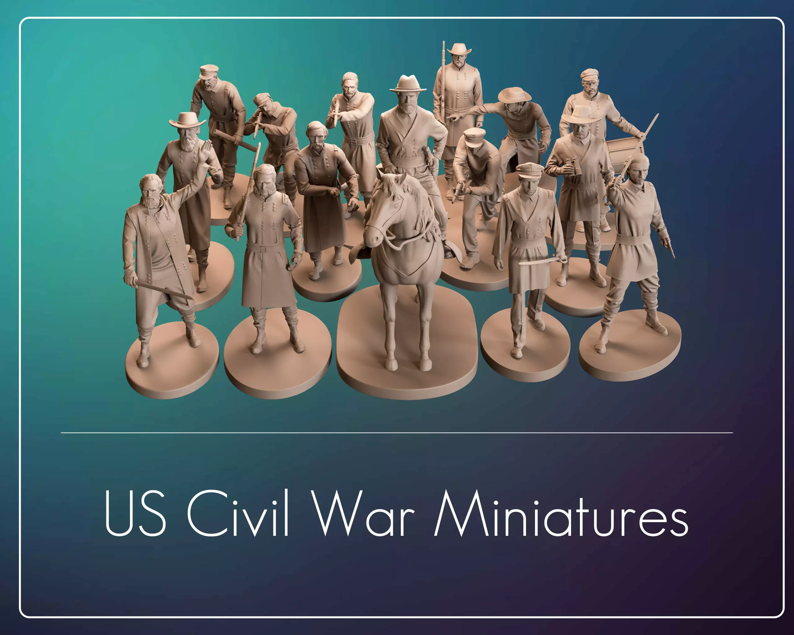 Collection of 3D printable historical miniatures inspired by the American Civil War, featuring a complete set of 30 full-body standing figures including 16 generals and 14 soldiers representing both sides of the conflict.