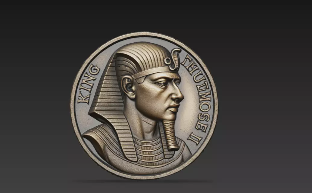 Ancient Egyptian Pharaoh Relief 3D Model features a highly detailed circular medallion inspired by classical Egyptian royal portraiture. The sculpt presents a powerful side-profile pharaoh wearing a traditional nemes headdress and ceremonial regalia, framed within a coin-style circular border.