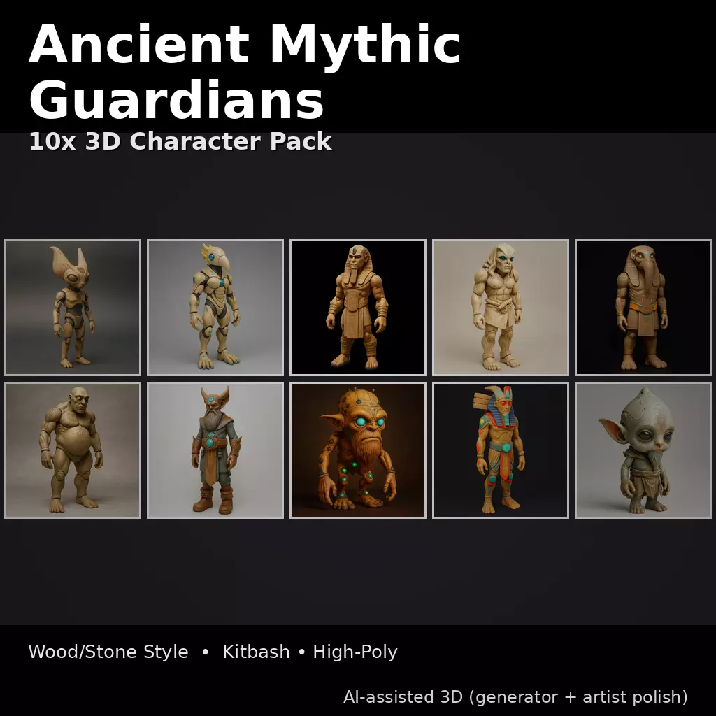 Meet the Ancient Mythic Guardians—a curated set of 10 stylized, high-poly characters inspired by ancient mythology, temple relics, and arcane sci-fi symbolism. Each character feels like a carved artifact brought to life, mixing wood/stone-like surfaces, engraved patterns, and glowing “energy” accents for a collectible, premium look.