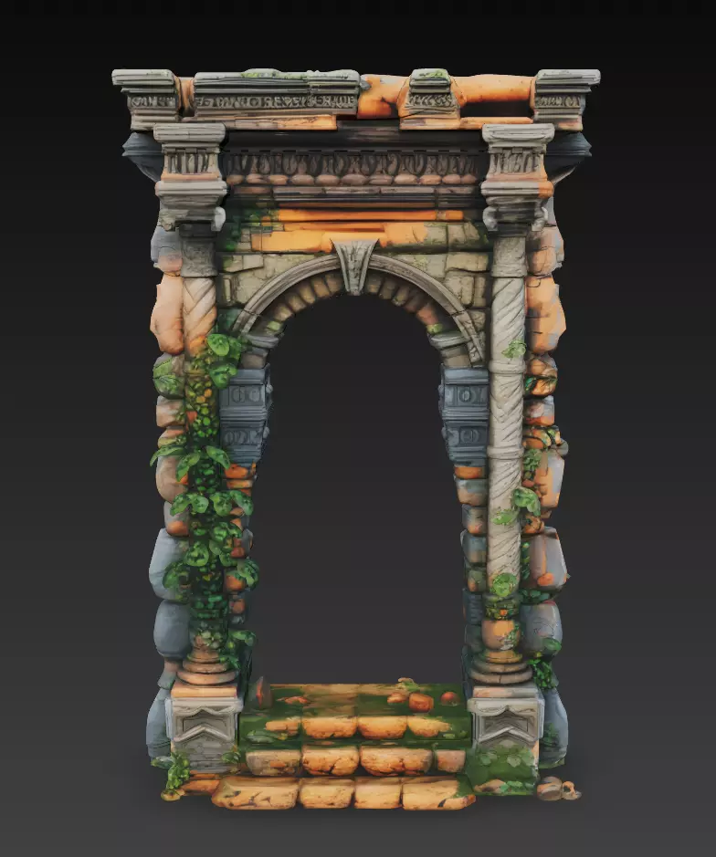 The stylized yet believable stone shapes, layered masonry, and aged surface details make this asset ideal for fantasy environments, historical scenes, RPG and adventure games, cinematic landscapes, and architectural visualization projects. Its tall silhouette and open passage design create a natural focal point for level design and storytelling compositions.