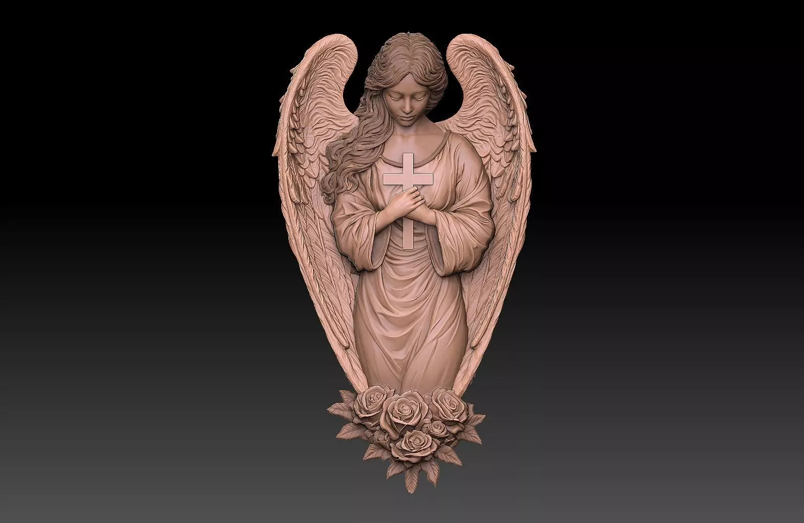 Elegant and detailed 3D angel relief depicting a serene angel holding a cross with folded hands, surrounded by soft wings and roses at the base. Perfect for CNC carving, 3D printing, engraving, or casting.The model includes a solid suitable for different manufacturing methods.