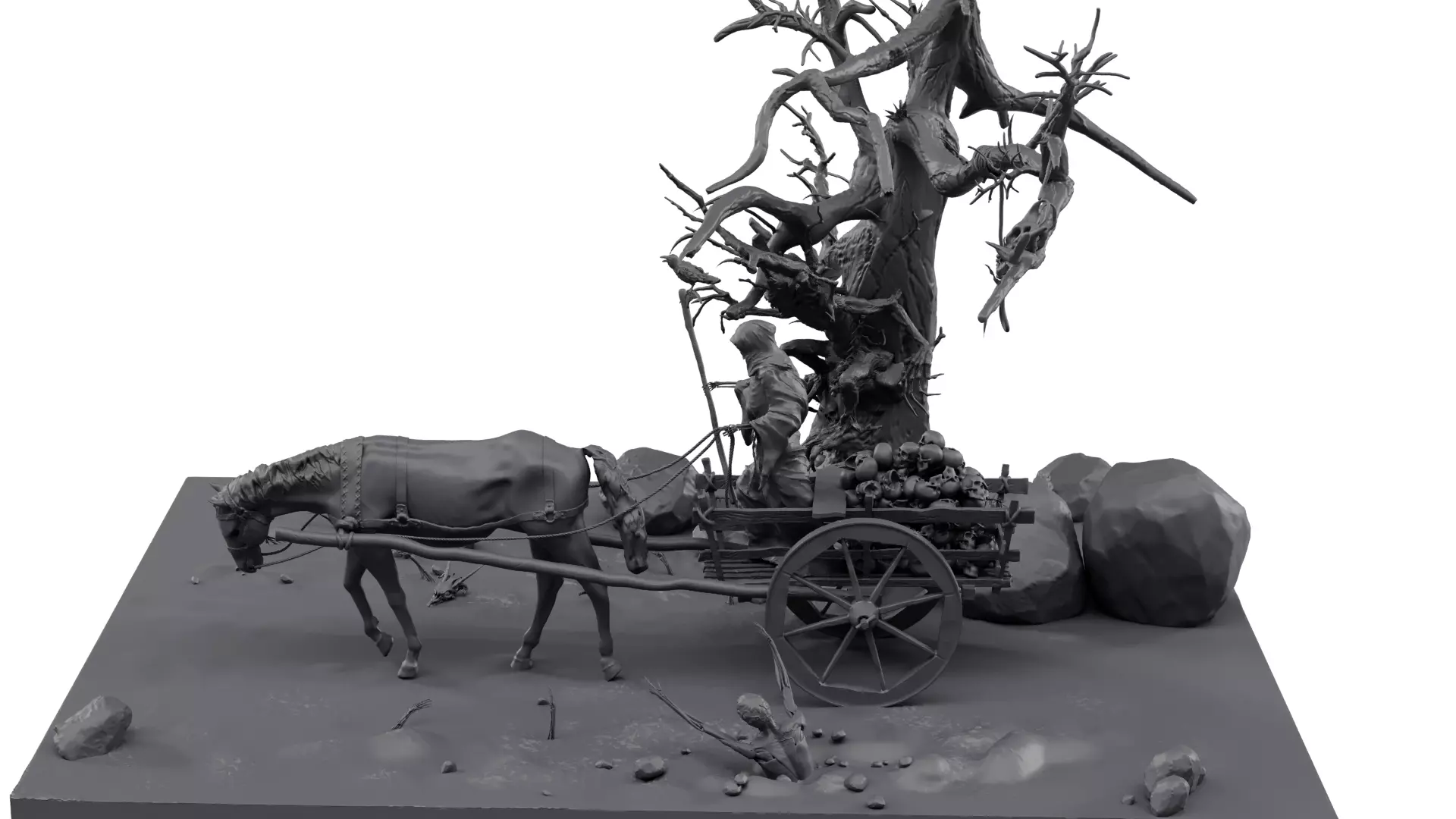 The 3D model is meticulously designed, with attention to detail paid to the skeleton's anatomy, the intricate design of the hoodie, and the cart and horse's details. The tree is designed with realistic textures and details, and the monster is carefully sculpted to give it a realistic and terrifying appearance.