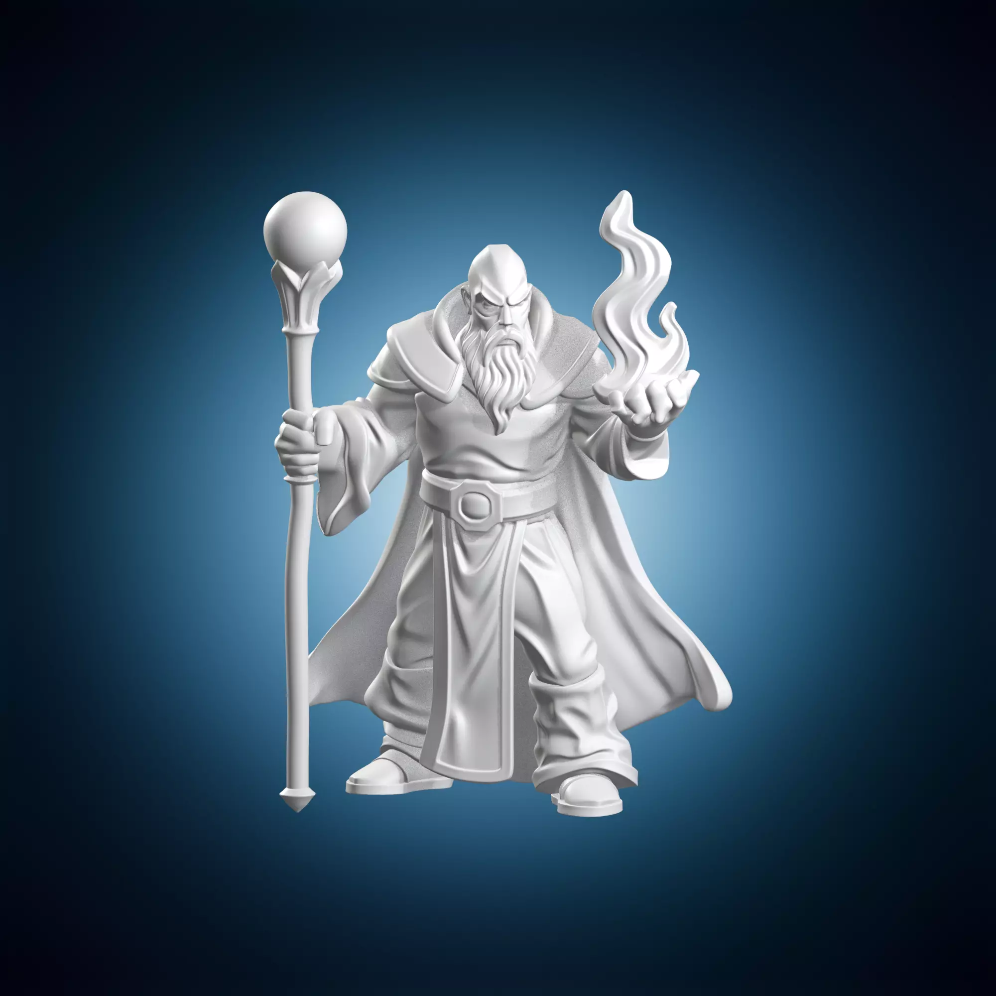 A detailed sculptural representation of a powerful wizard casting a fire spell in a fantasy setting. The miniature features intricate details and a dynamic pose, capturing the essence of magic and fantasy art. Suitable for collectors and enthusiasts of magical themes.