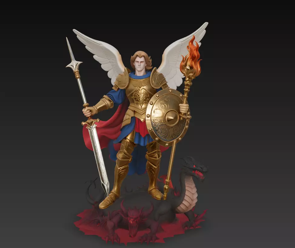 This high-detail 3D sculpture depicts a powerful archangel warrior standing triumphantly over a defeated dragon.The model features intricate armor, large angelic wings, a flaming staff, a long spear, and a detailed round shield.Designed for collectors, 3D printing, CNC, digital art scenes, and statue production.