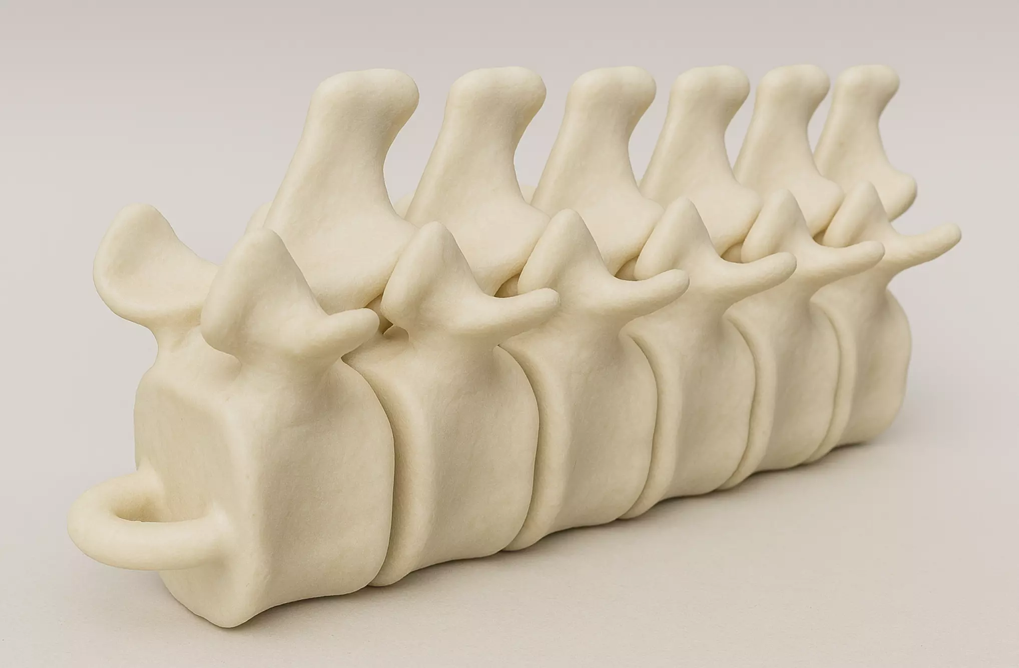 The spines should be printed as oriented, with the spinous processes pointing upward. Changing the orientation of the file will result in an incorrect print of the internal ball joint between adjacent vertebrae.The lateral transverse processes are designed to print without support. Therefore, you only need to support the base of the vertebral bodies and the “loop” if you’re printing files with a top loop.To properly support the curved underside of the vertebral body, try raising the object 3 mm off the build plate and use “Line” supports in Cura, with the support density increased to 40%.After printing, there may be small adhesion points in the internal ball joint and facet joints. Simply perform a gentle spinal mobilization and they will release and move freely. Make sure to let your print cool completely first — if the plastic is still soft, the connector may break when moved.To create your own spine, import the number and types of vertebrae you need into the same origin point in your preferred software. Leave the upper vertebra at the origin and move the remaining vertebrae backward in 15 mm increments (for example, move the second vertebra 15 mm, the third 30 mm, and so on). You can make the spine as long as you wish, limited only by your build plate size.Please note: these are not anatomically accurate! For design purposes, each vertebra is modeled after the same vertebra, L3. The vertebral hole has been filled in for strength and to minimize overhangs, and the articular processes have been significantly reshaped to allow smooth movement.