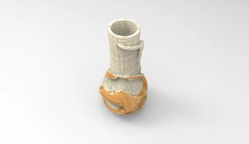 This model is a sophisticated blend of minimalist precision and fluid art. The main body is characterized by a dense, vertical ribbed (pinstripe) texture in a clean off-white finish, giving it a tactile and refined appearance. Wrapping around the base and neck is a dynamic, swirling ornament in a warm caramel-wood tone, which adds a sense of movement and hand-sculpted character to the piece. It is an ideal asset for high-end interior visualizations, modern luxury staging, or boutique retail CGI environments.