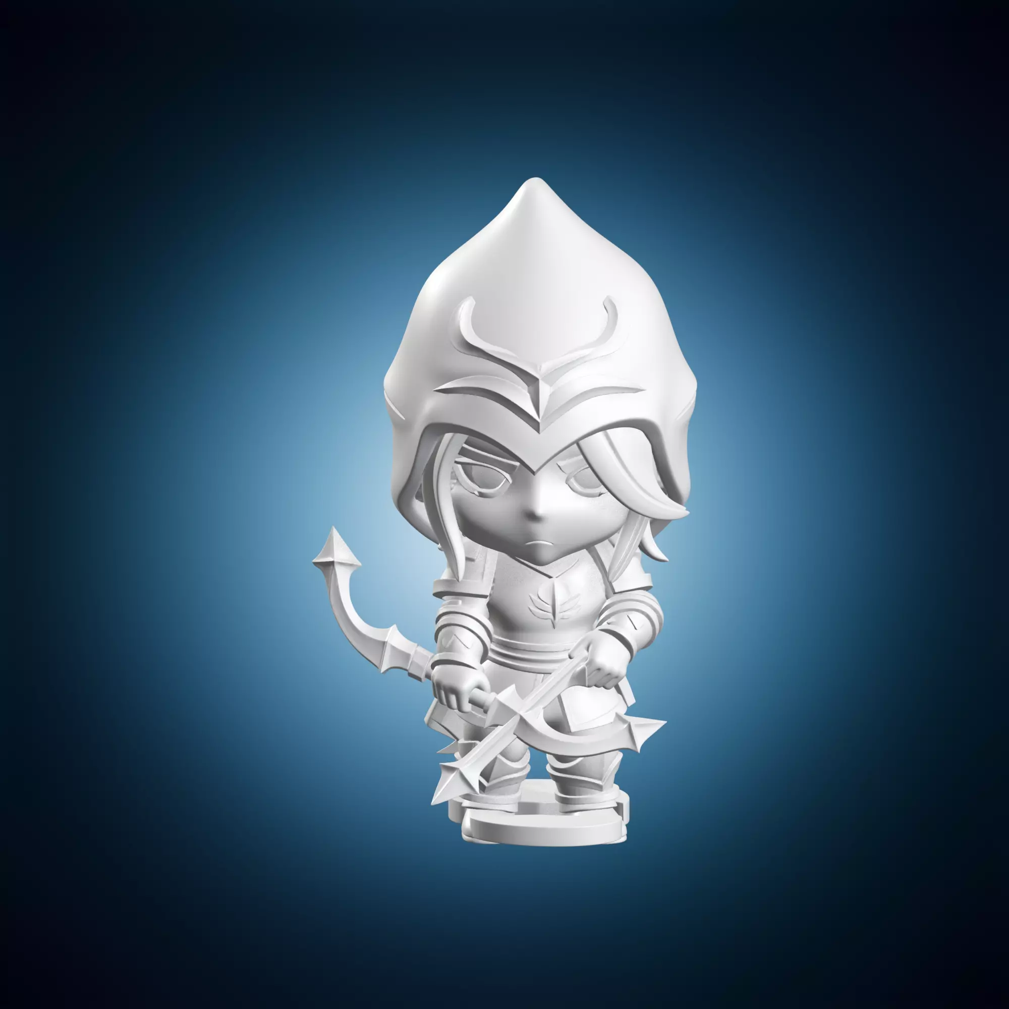 A chibi style 3D model of Ashe from the popular game League of Legends as an ice archer. The model is designed to be visually appealing and can be used for various purposes such as cosplay, gaming accessories or decorative items. It features intricate details and a cute aesthetic. This 3D model is created in a chibi style that is reminiscent of anime and manga art.