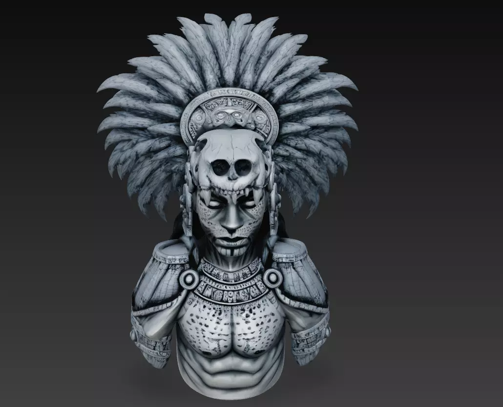 This 3D model features an Aztec Jaguar Warrior, a legendary figure representing power, courage, and divine strength within Mesoamerican culture. The sculpture combines historical accuracy with stylized artistry, emphasizing the warrior’s intricate feather headdress, jaguar skull ornament, and ritualistic body markings.