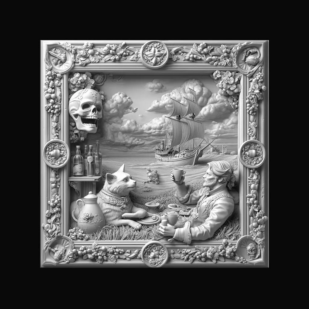 High-resolution 3D grayscale relief wall art showing a whimsical bar scene of a cat and a noble gentleman enjoying coffee by the seaside. The background features majestic sailing ships under dramatic clouds. The scene is framed by highly detailed floral elements, a skull, vintage bottles, a mask, and symbolic bar motifs. Ideal for CNC wood carving, laser engraving, 3D resin printing, and decorative wall panels.