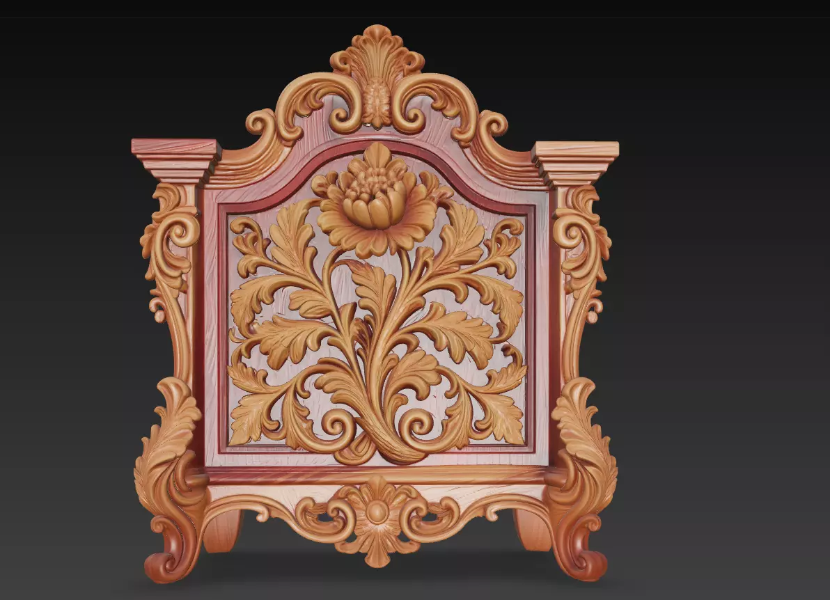 Every element — from the intricate scrollwork to the bold floral centerpiece — has been sculpted with artistic precision. The design balances symmetry and flow, creating a luxurious decorative piece suitable for 3D printing, CNC carving, or CGI furniture visualization.