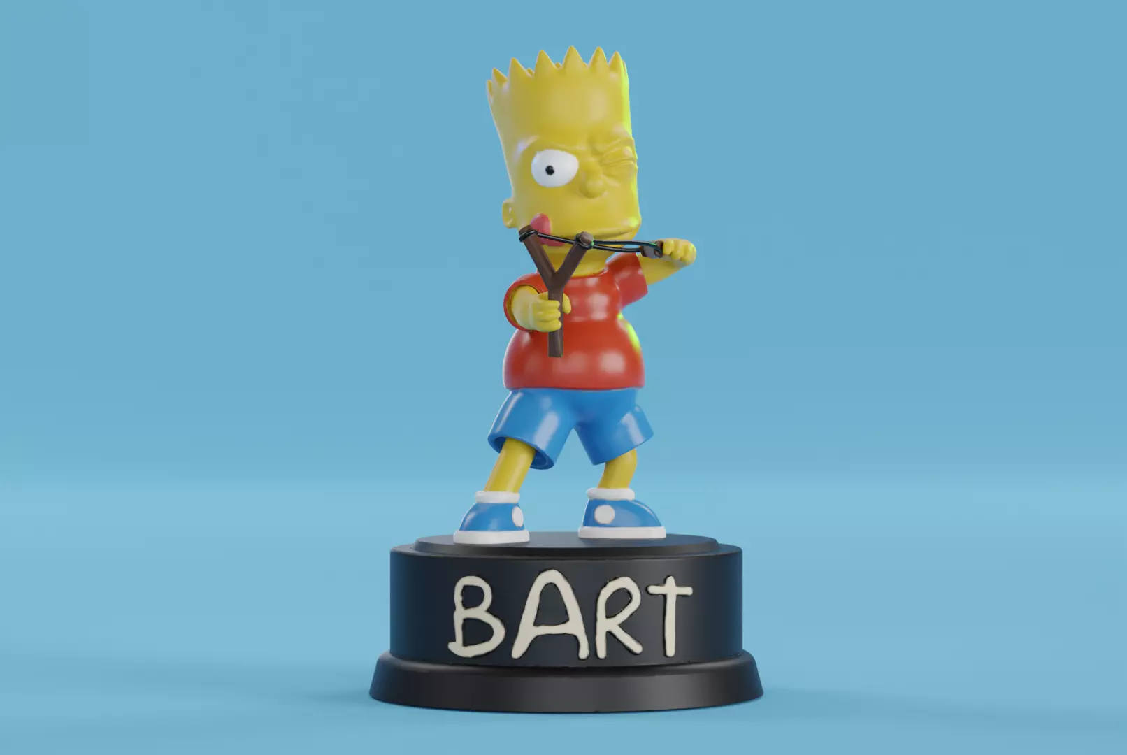 This high-poly 3D model of Bart Simpson holding his iconic slingshot is perfect for 3D printing enthusiasts and fans of The Simpsons. Designed at an approximate size of 6-7 cm, the scale can be easily adjusted to fit your needs.