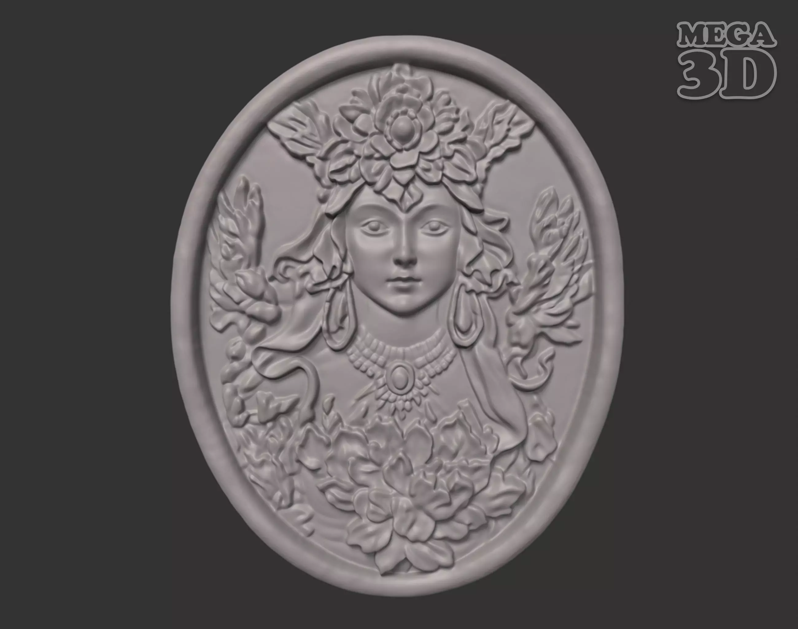 This Art Nouveau bas relief showcases a woman's portrait. Available in STL and OBJ formats, it can be 3D printed or used with CNC. The default height is 5cm, but it's easily customizable.