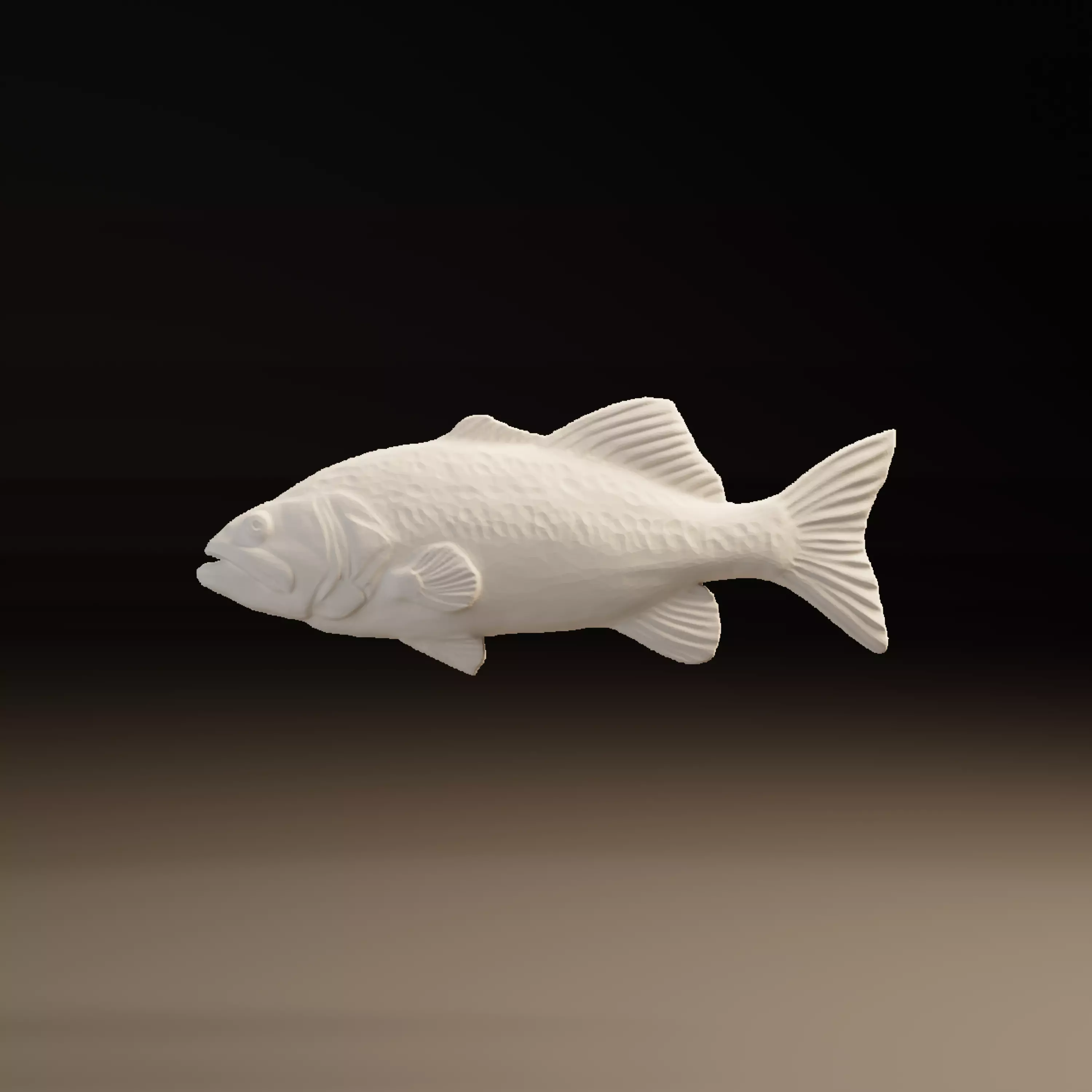 Detailed bas relief model of a bass fish designed for CNC machining and 3D printing. The model features realistic anatomy, scale texture, and clean relief depth making it ideal for woodworking projects, fishing decorations, and custom rustic artwork.