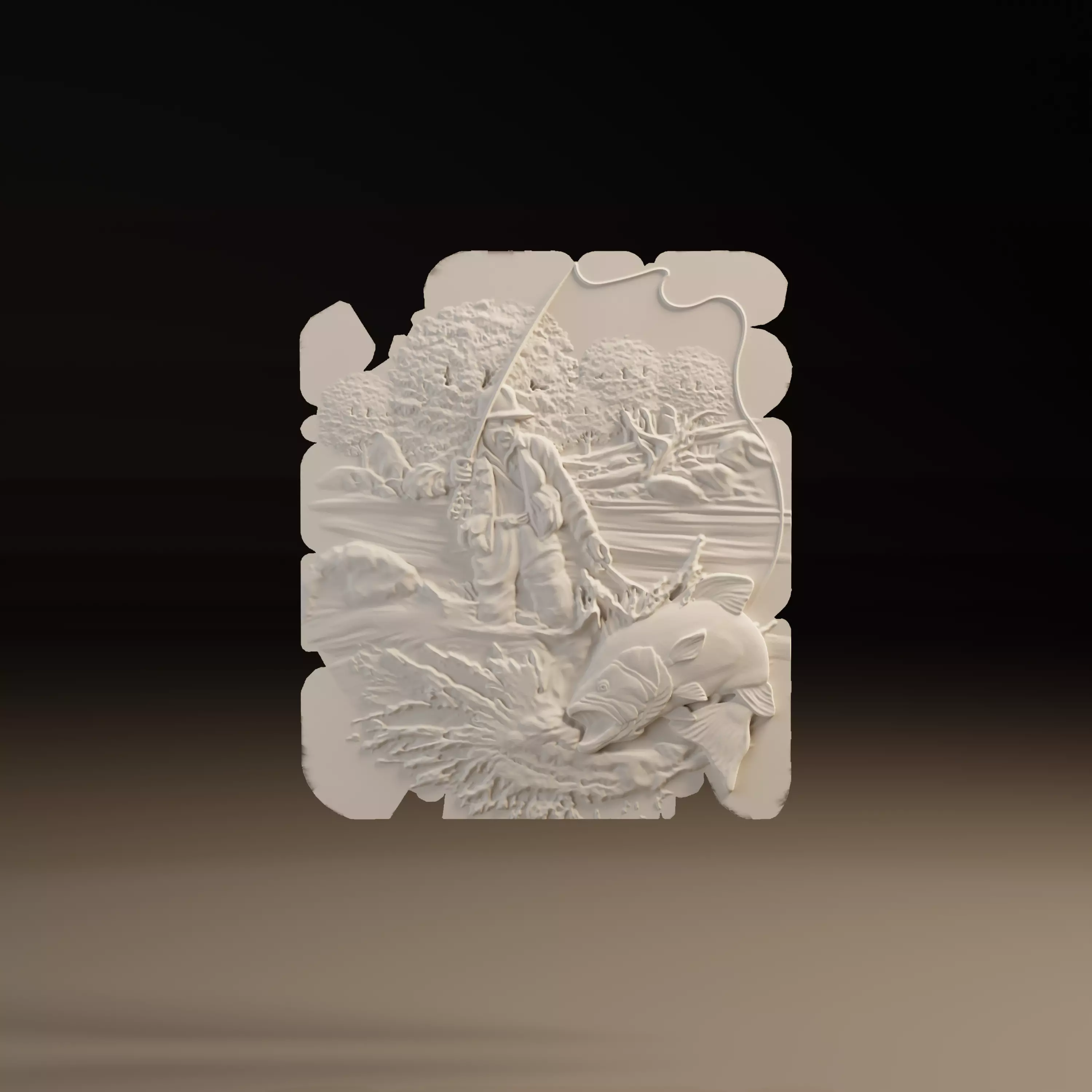 Highly detailed bas relief model showing a fisherman catching a large bass in a dynamic river scene. The composition includes water splash effects, natural landscape, trees, and realistic fishing action, making it perfect for rustic decoration, fishing cabins, lodges, and woodworking projects.