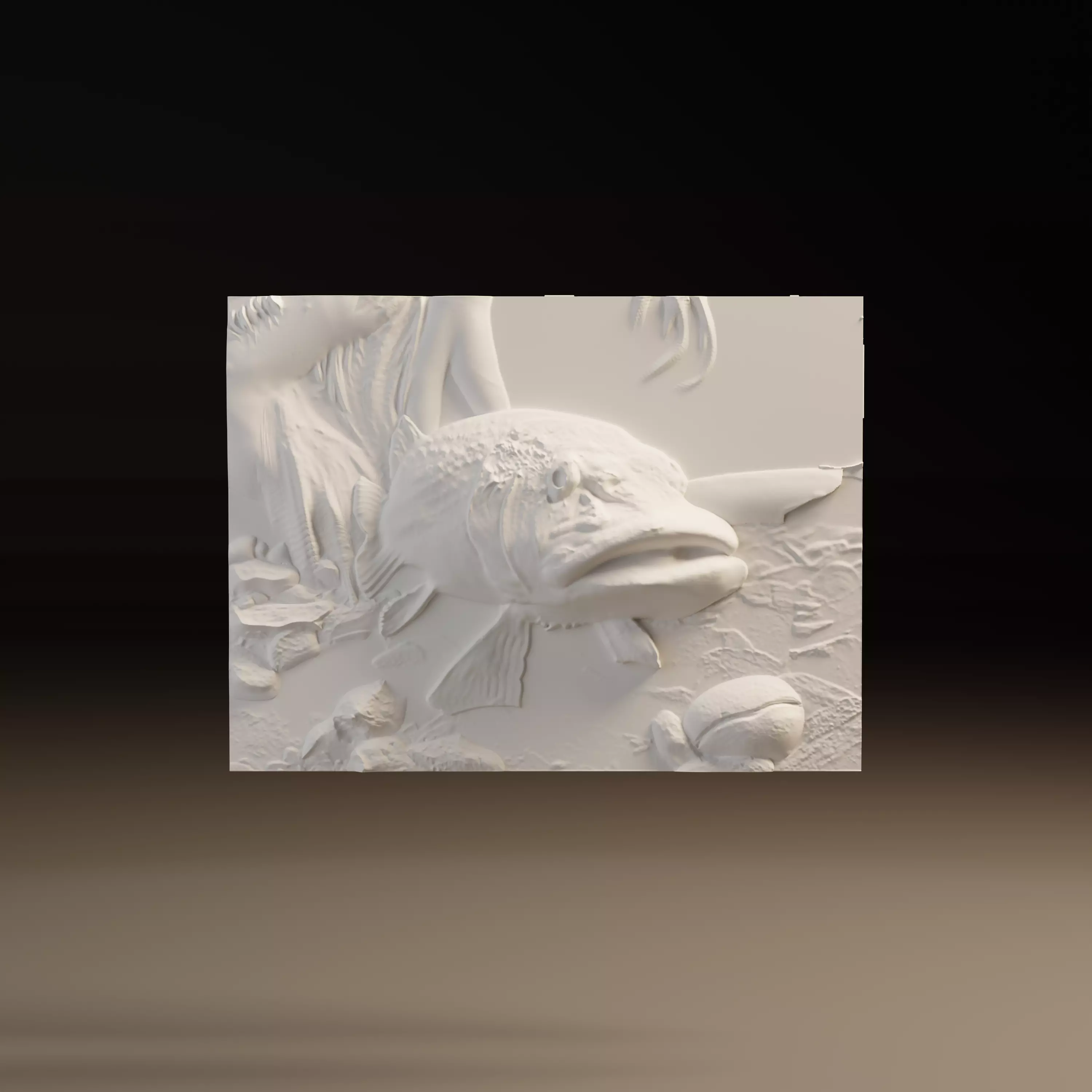Detailed fishing bas relief model featuring a realistic bass fish in an underwater natural environment, designed for CNC milling and 3D printing.