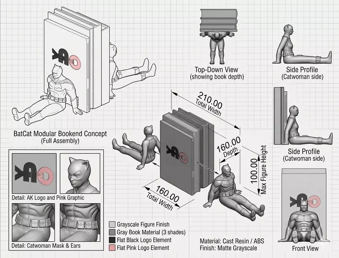 Kurzbeschreibung:Minimalistische Buchstütze im 3D-Look mit einer stilisierten „Bat Cat“-Figur. Die Figur sitzt entspannt mit ausgestreckten Beinen und lehnt direkt an den Büchern, wodurch eine stabile und dekorative Stütze entsteht. Das Design verbindet Comic-Ästhetik mit moderner, skulpturaler Form – ideal für Regale, Comics oder als Fan-Dekoration.