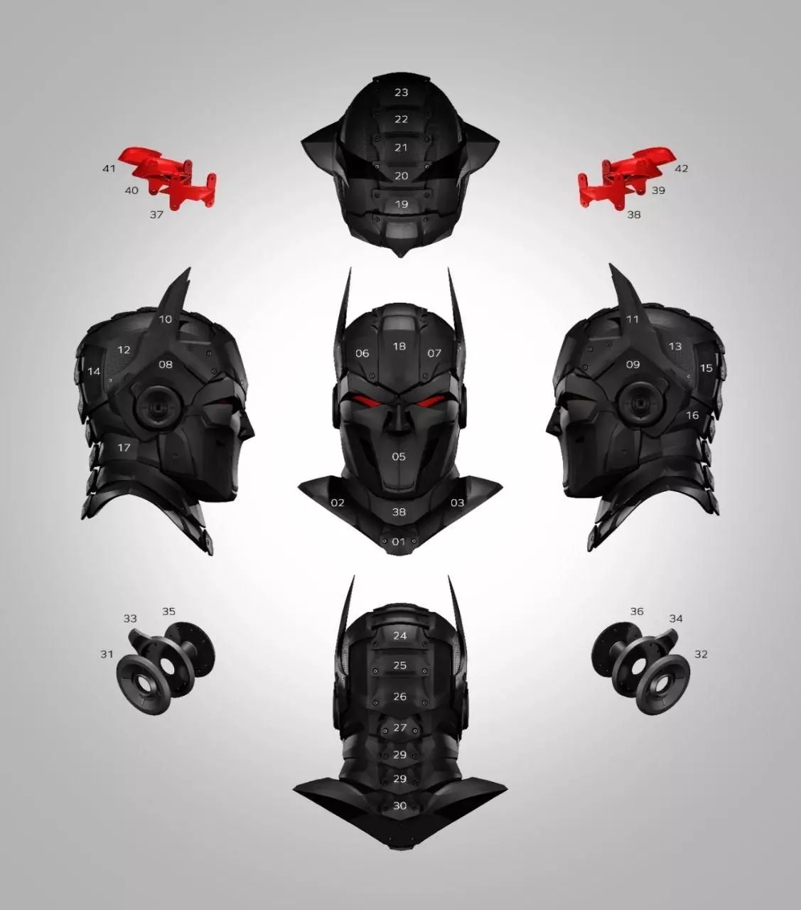 La máscara presenta el diseño característico de Batman Beyond: contornos afilados, superficie aerodinámica y el aspecto oscuro futurista que define al héroe del mañana. Cada curva y ángulo fue cuidadosamente modelado para mantener fidelidad al estilo del personaje y garantizar un resultado final profesional.