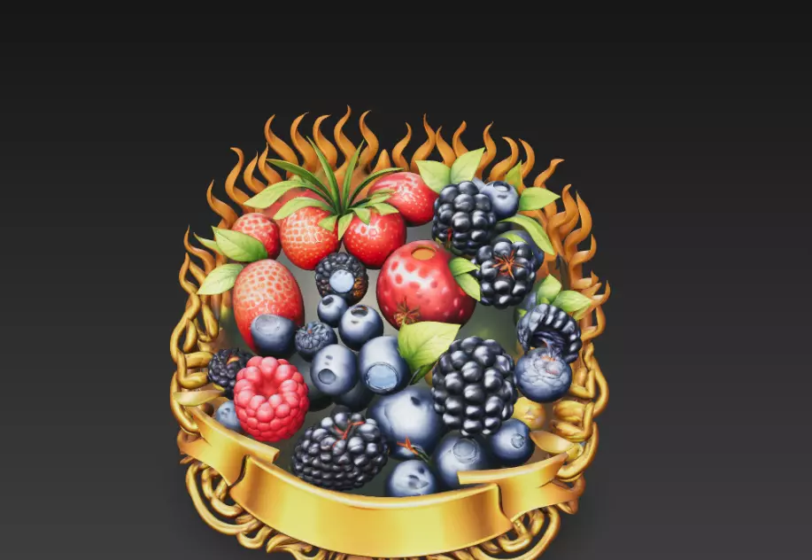 Berry Harvest Royal Emblem 3D Model features a vibrant decorative crest composition showcasing strawberries, blueberries, blackberries, and raspberries surrounded by fresh green leaves and framed within an ornate golden heraldic structure.