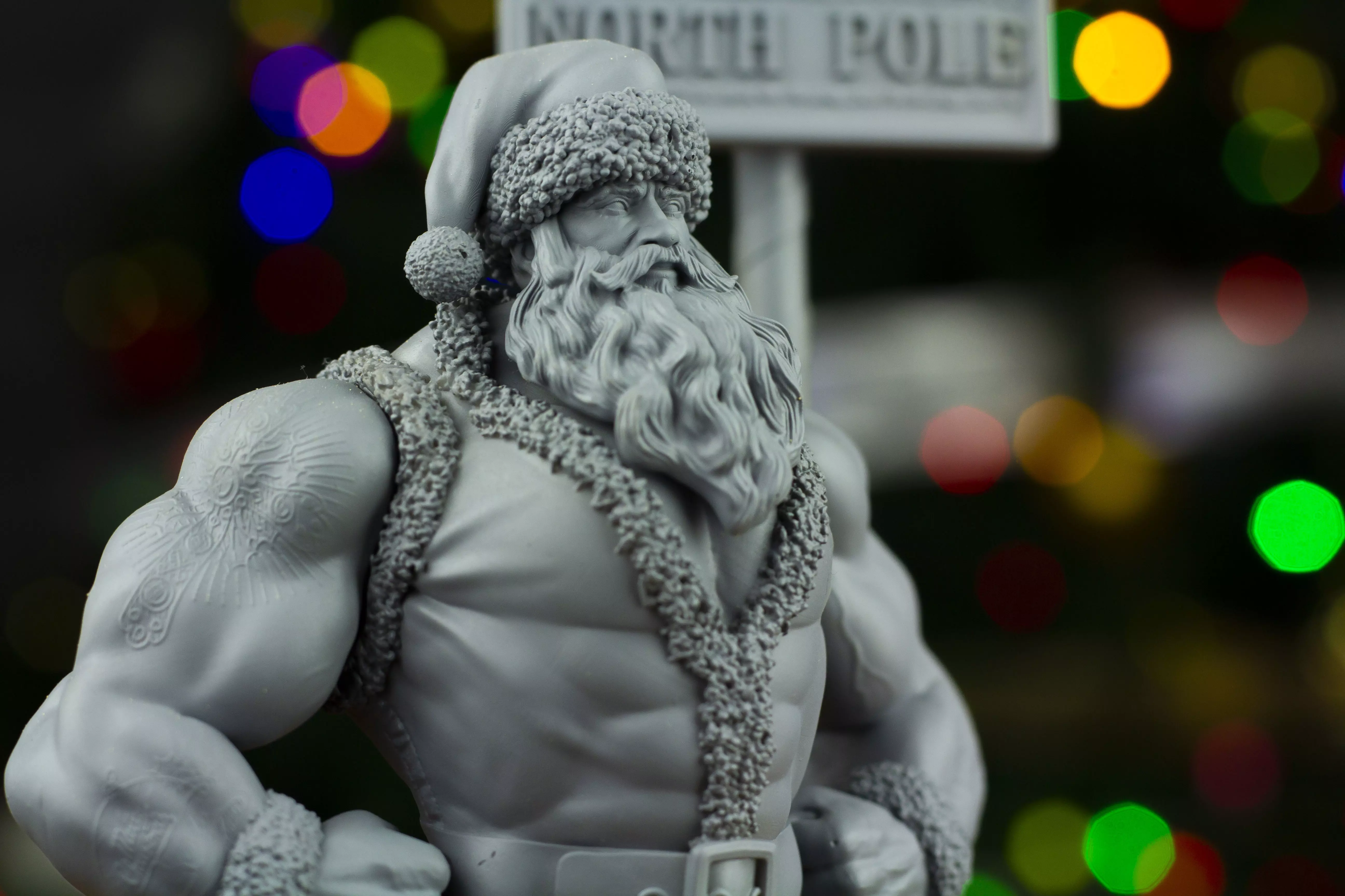 Hi everyone, this is my entry for the Christmas Challenge. My character is Big Santa, sculpted in ZBrush. I made the cuts in strategic places so they wouldn't be noticeable when the whole piece is glued together. As for the design, it has beautiful details like the tattoos on his arms, veins on his biceps, the sack with his gifts, rock textures on the base, and snow falling on surfaces like the NORTH POLE sign and the base. My Big Santa character is mentally and physically ready to deliver gifts around the world. Don't forget to have his milk and whey protein ready for Christmas! Good luck and congratulations to all the contestants, and thanks to Cgtrader for creating these contests so we can showcase our talents and creativity! MERRY CHRISTMAS! #ChristmasChallengeNote: I printed the prototype in gray resin.