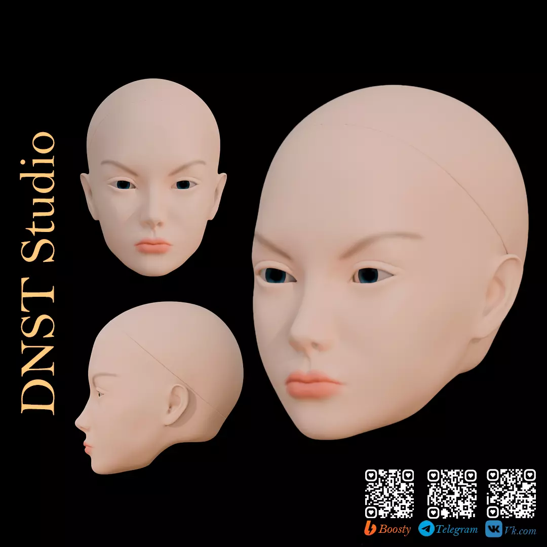 Female head for creating BJD dolls. Made in the Blender program. The set includes 4 parts: a head, a head cover, eye and eyes with a mount. The original size is under 10 cm of the doll for more convenient scaling.