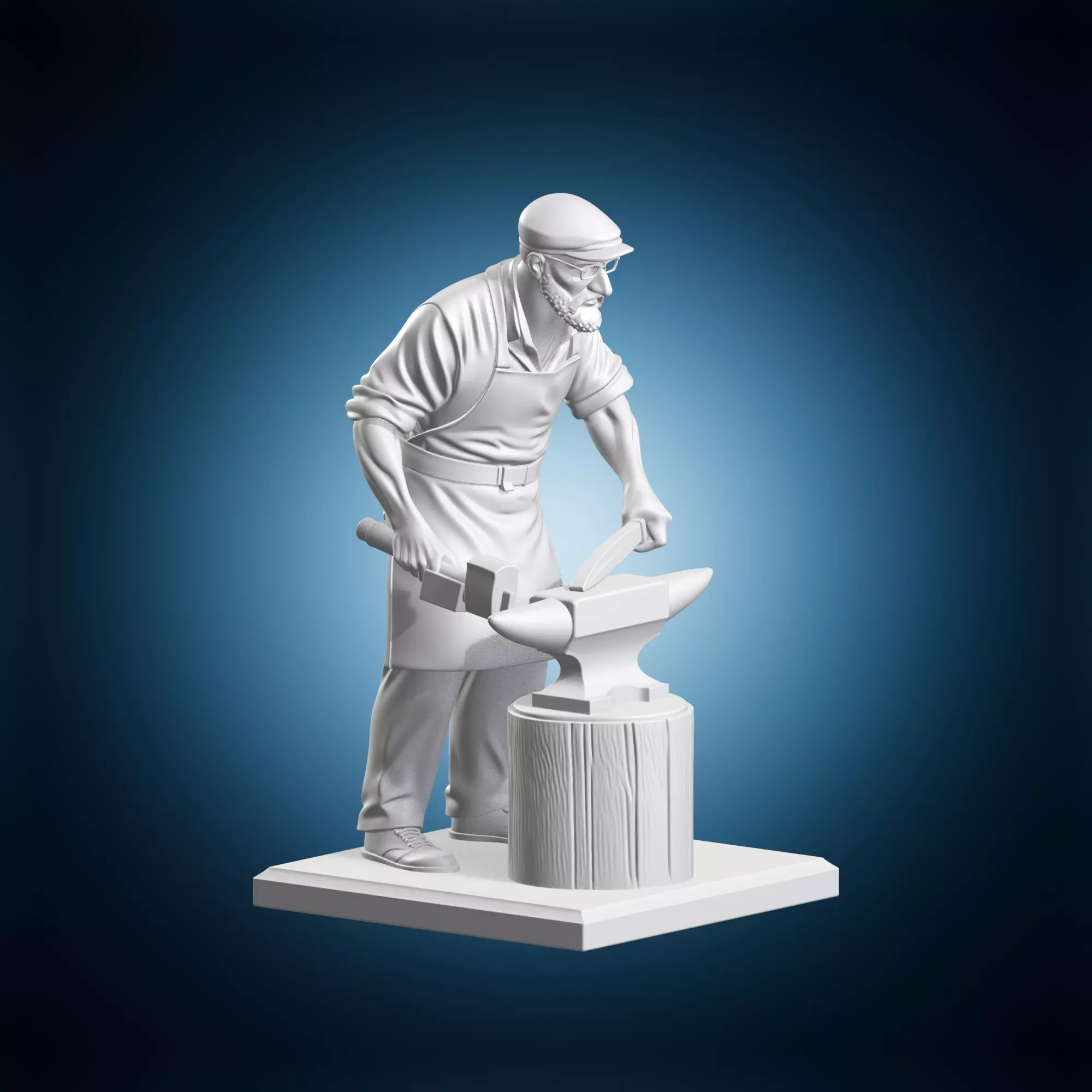 A highly detailed and realistic figurine of a blacksmith craftsman working at an anvil. The model features intricate textures and details, making it suitable for artists, sculptors, and designers who want to add depth and realism to their projects. It can be used as a reference or directly in 3D modeling software. This figurine is perfect for creating scenes of medieval times or fantasy settings. The level of detail is exceptional, with visible sweat on the blacksmith's face and tools scattered around the anvil.