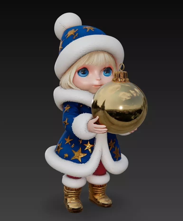 The Blue Winter Girl – Festive Christmas Ornament Character 3D Model captures the cozy elegance of the holiday season. Dressed in a star-patterned blue coat and holding a golden ornament, she embodies the sparkle and wonder of winter celebrations.