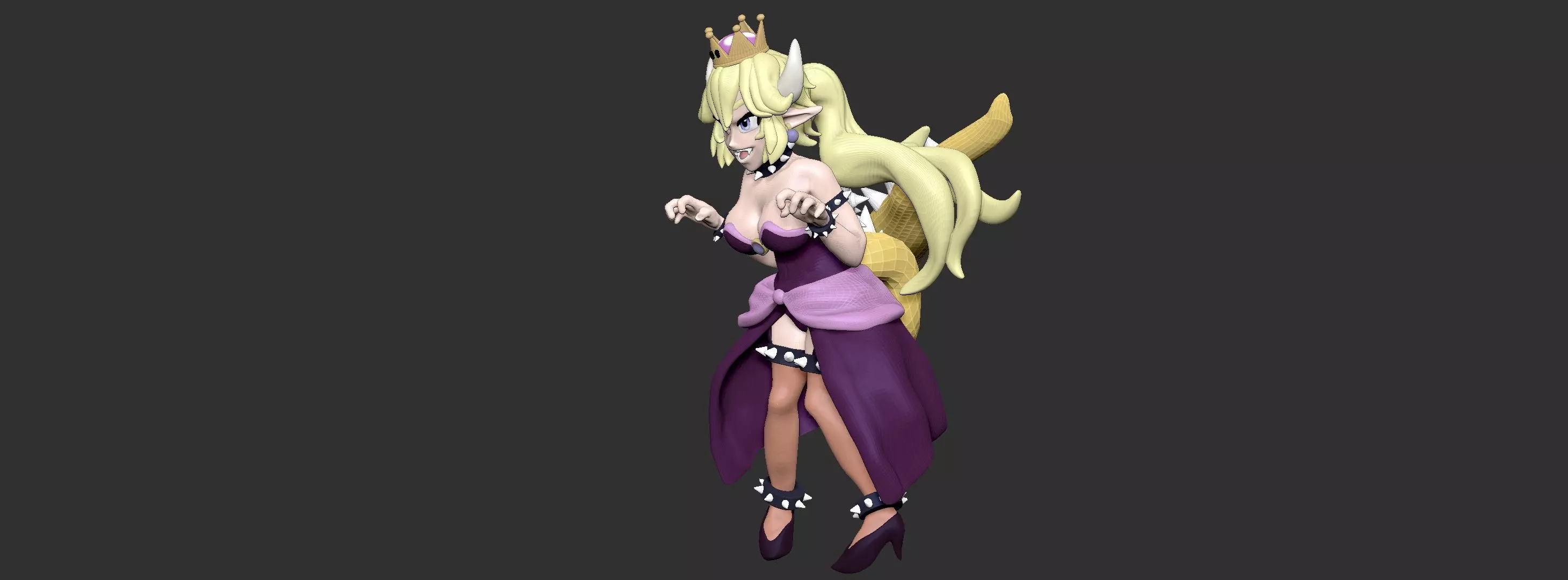 Model made in pieces of the enemy of Mario Bross (Bowser) turned into a princess, thanks to the crown of Princess Peach.The model is divided into head, tail of the hair, torso, legs, tail, the base so that it can stop and the part of the skirt that can be removed or put so that it does not cover its legs.The STL file is in a size of 15 cm high, for a good impression and to see the model well.I use the Cura program and I print on ABS material, in this case there are very small parts that you have to be careful when removing the supports.For an optimal impression of the floor print each part of the side, not lying on the front.