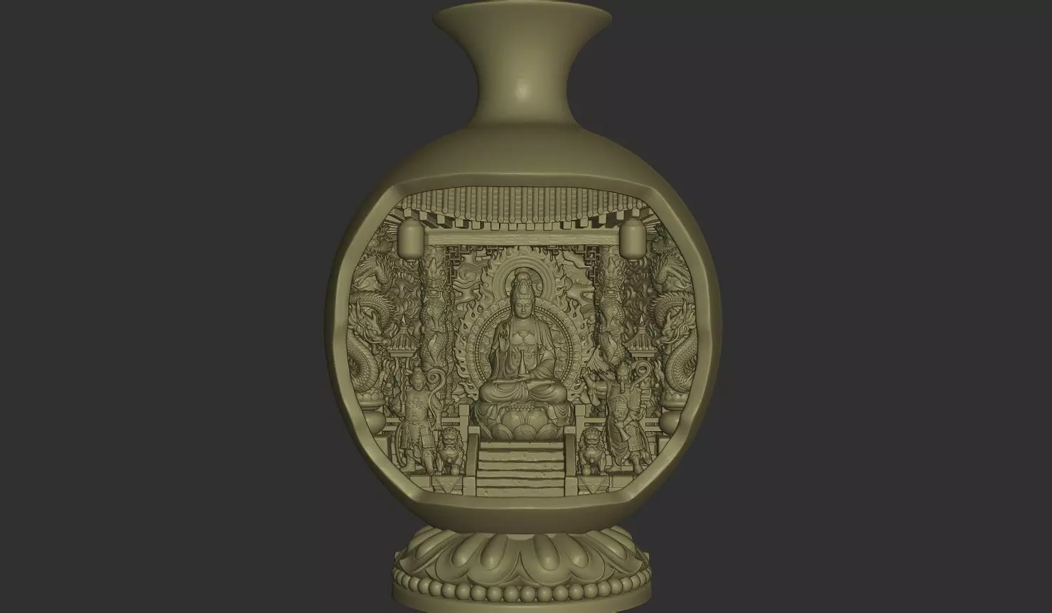 This 3D model features a sacred altar scene intricately sculpted inside a vase-shaped design. At the center sits the Buddha on a lotus pedestal, surrounded by guardian deities, detailed dragons, and traditional temple architecture.