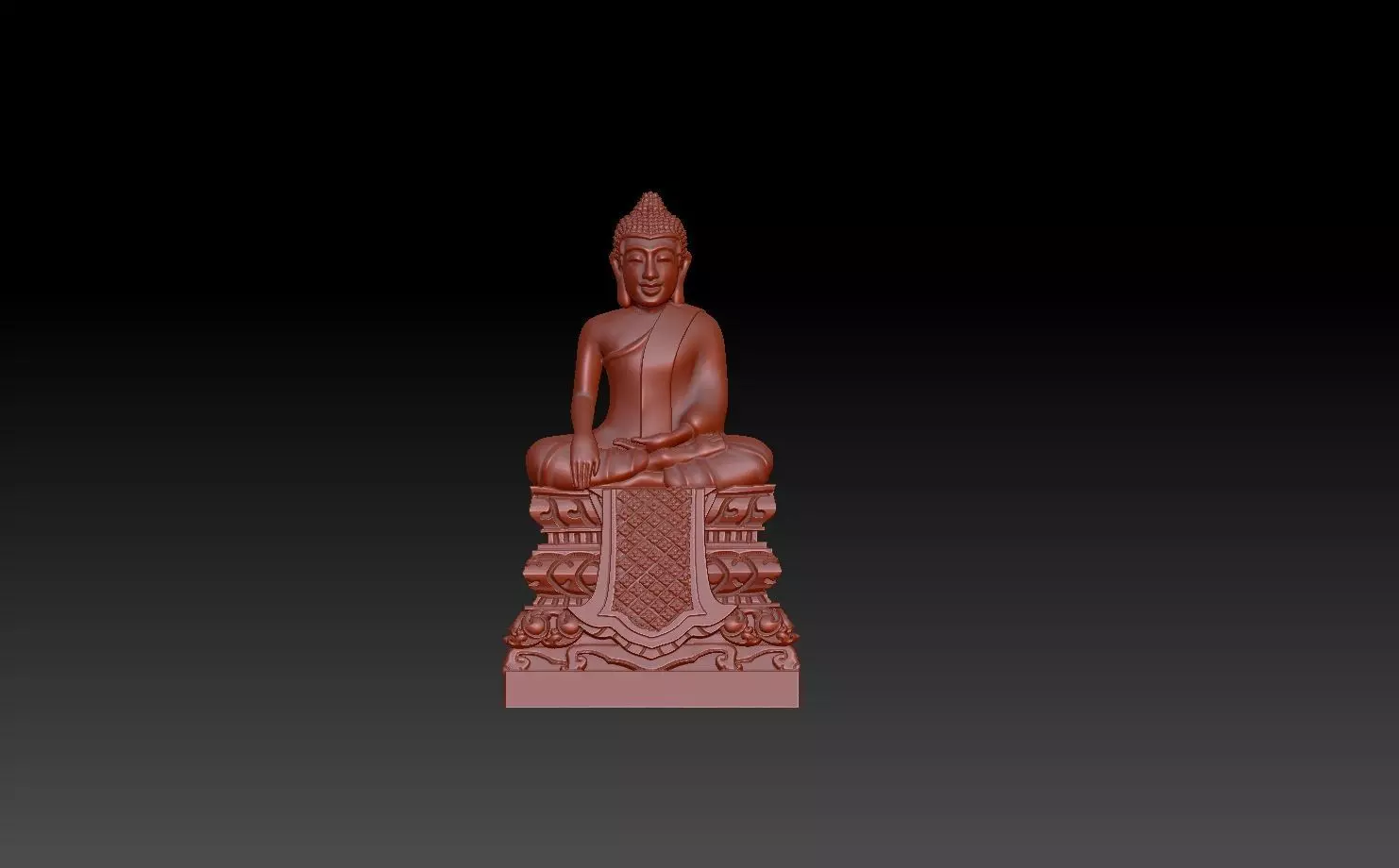 The lotus seat beneath the Buddha signifies transcendence over worldly defilements.