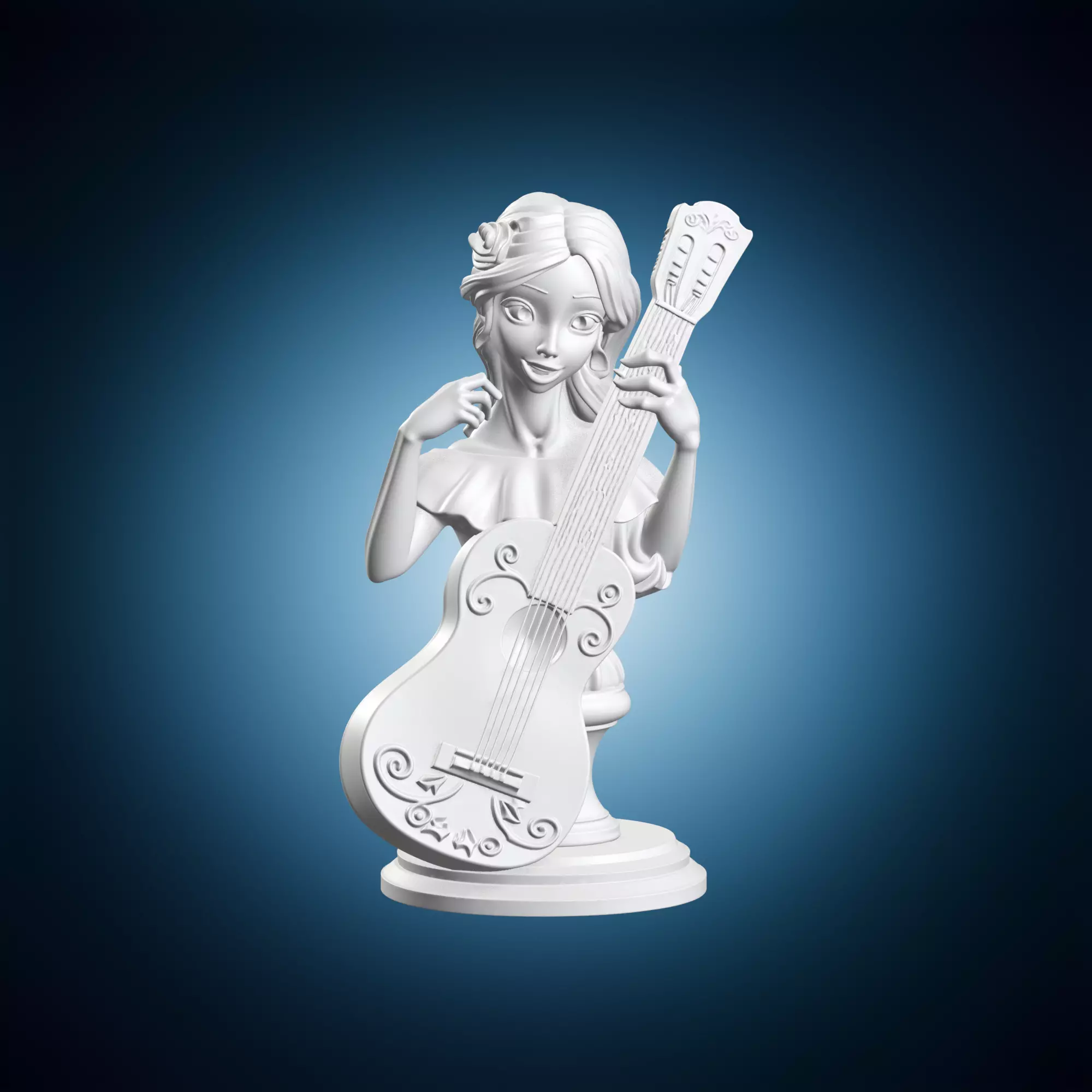 A stylized cartoon girl playing guitar as a character statue. Suitable for decorative purposes, this 3D model can be used in various art forms such as painting, drawing, or digital illustrations. The character's design is inspired by popular cartoons and anime, making it appealing to fans of these genres.