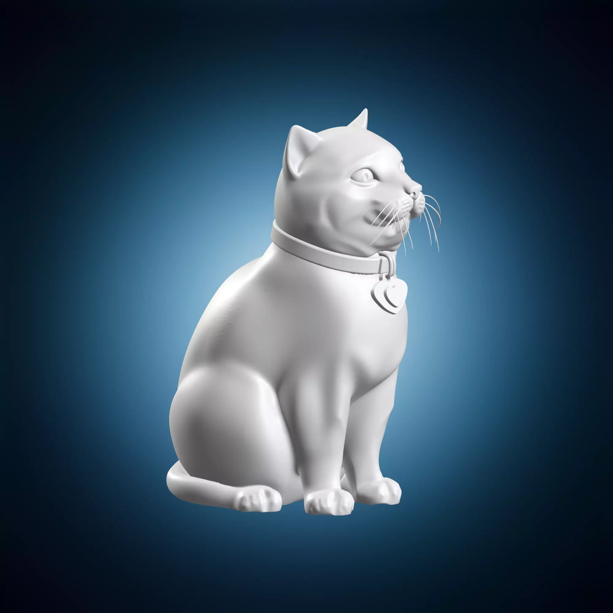 A detailed, three-dimensional model of a sitting cat figurine with a collar, suitable for use in various artistic applications such as animation, video games, or architectural visualization. The model is designed to be highly detailed and accurate, making it perfect for sculptors, animators, and artists. It can also be used for educational purposes or as a decorative piece. The model has been created using 3D modeling software and is available in various file formats, including STL, OBJ, and FBX.