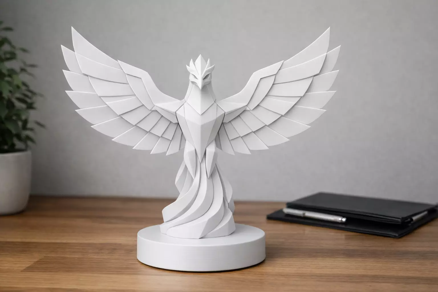 The Celestial Geometry Phoenix is a modern geometric sculpture that reimagines the legendary phoenix through a minimalist architectural design language.