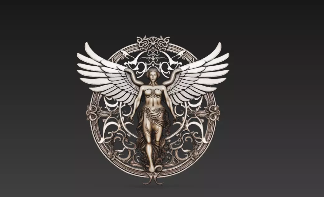 Celestial Winged Angel Relief 3D Model features a beautifully sculpted standing angel figure with fully extended wings, framed within an ornate circular gothic structure enriched with intricate ornamental patterns.