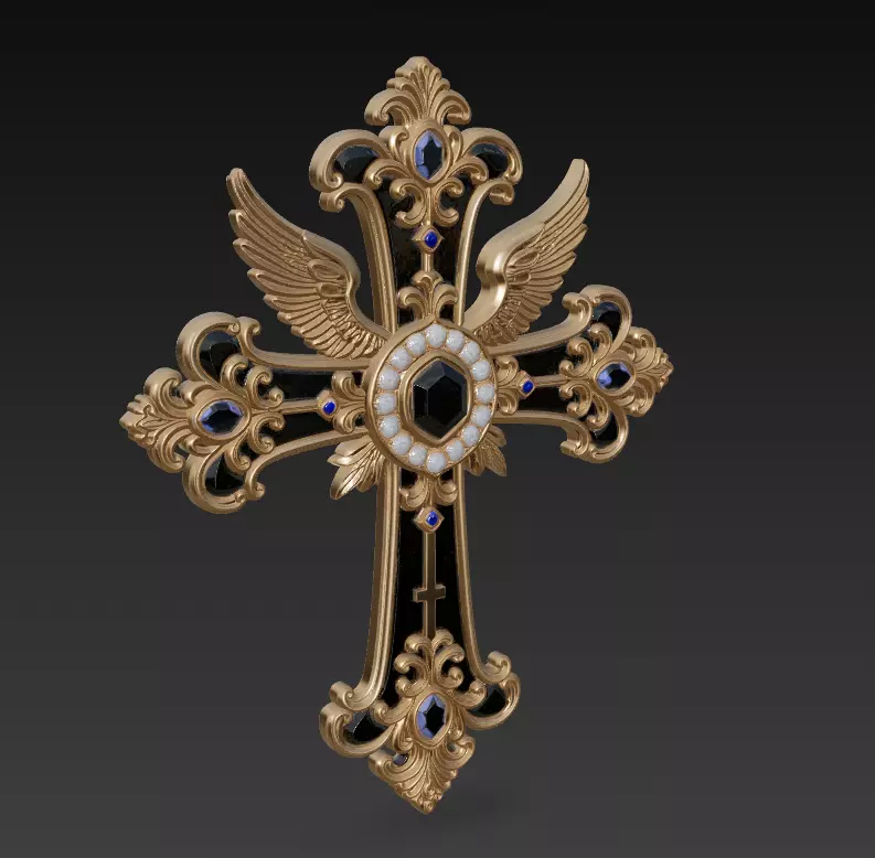 Each arm of the cross is decorated with layered curls, sculptural motifs, and blue jewel settings that enhance the artifact’s holy and regal aesthetic. The symmetrical wings add a celestial symbolism, making the design feel like a sacred relic carried by angels or displayed within a royal chapel or fantasy cathedral.