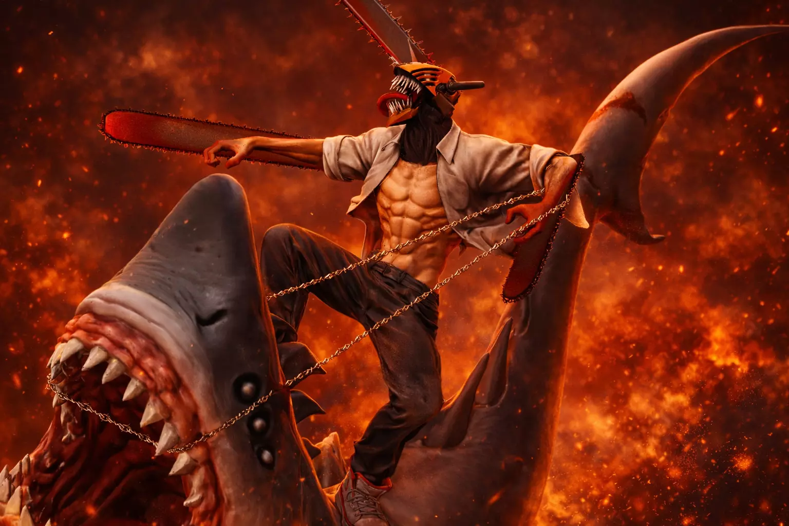 This dynamic anime-style figure captures an intense action scene with extreme attention to detail: sharp chainsaw blades, realistic anatomy, aggressive shark textures, flowing clothing, and a powerful combat pose. The sculpt is designed for collectors, painters, and resin 3D printing enthusiasts who want a premium display piece.
