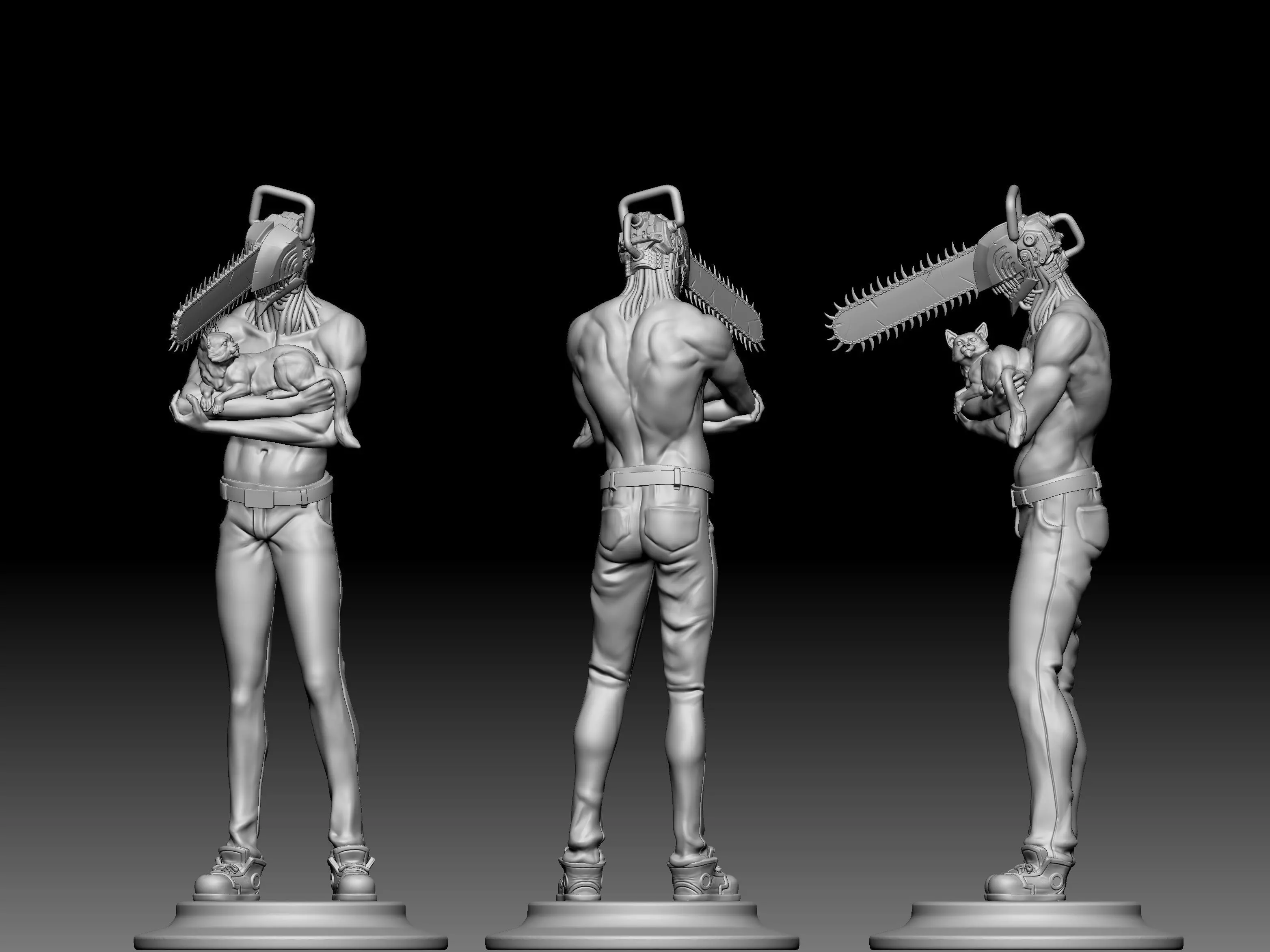This is a model of chainsaw man that I did after I read a specific part of the manga while Denji takes a cat into his arms :). It is fully sculpted in Zbrush, I split the model in 3 parts, upper part, bottom and the base. I already 3d printed it myself to test the balance, and it works pretty well, the chainsaw has thin parts, so I recommend being careful while cleaning the print (I accidentally broke a couple of its teeth …)