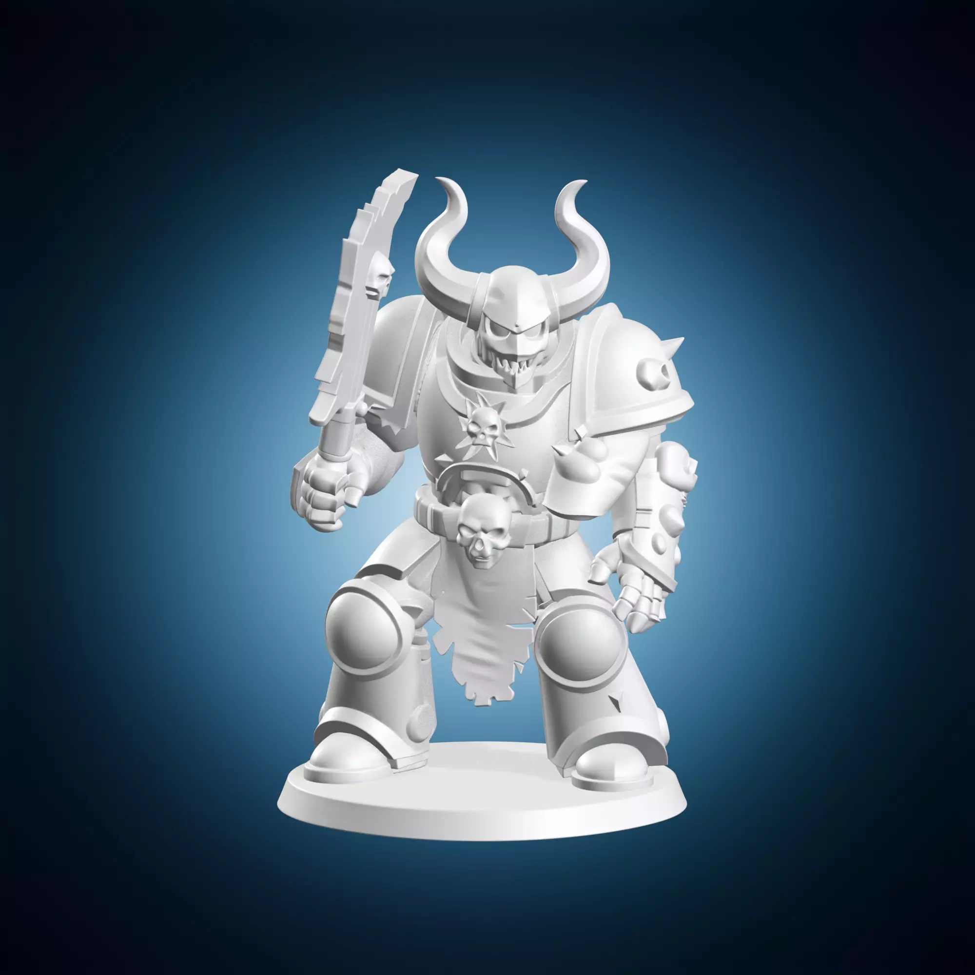 A 3D model of a Chaos Space Marine holding a cleaver. This character is inspired by the Warhammer 40k universe and could be used for gaming, cosplay, or as a prop for photography. The model features intricate details and textures to create a realistic appearance. It can be used in various scenes such as battles, rituals, or everyday settings. The image is highly detailed and suitable for printing or digital use.