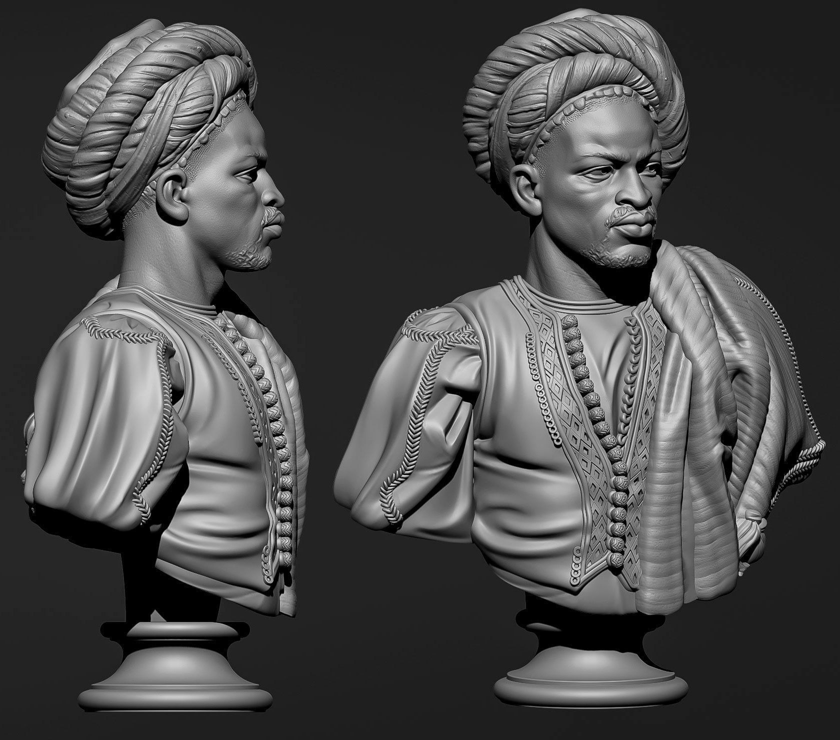 Negre-du-Soudan [Negro-from-the-Sudan]In 1847, Charles Cordier was struck by the beauty of an African-model, a former slave, and made his portrait. He then decided to devote his career as a sculptor to representing the diversity of human physiognomy. He brought a large number of busts back from his trip to Algeria in 1856. This portrait was shown at the 1857 Salon as Negro from the Sudan. The Salon was an exhibition held first biennially then annually, where artists presented their latest works to the public. It was one of Cordier's first polychrome works. The face is made of bronze and the mantle and turban of onyx marble from Algeria. The onyx quarries used in ancient times had just been rediscovered. Onyx marble characteristically ranges in colour from red to white, with stripes running through the blocks of stone. Cordier used these features to render the colourful effect of oriental fabrics. He also exploited the range of colours to be obtained from bronze. The metal surface of the Negro from the Sudan was initially silvered, then oxidised, which blackened it. Such use of colour was a novelty at the time when people were accustomed, as in the main gallery of the Musée d'Orsay, to seeing white marble or bronze sculptures.Nothing is known of the model who posed for Cordier except that he played the tam-tam in the festivities of Alger's Muslim community before Ramadan. In an admiring, respectful manner, Cordier has managed to render his natural nobility, which prompted comparisons with a Roman emperor.