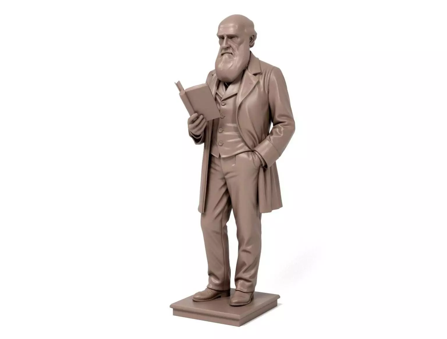 This statue of Charles Darwin captures the renowned scientist in a thoughtful pose, featuring detailed attire and accessories such as a book, which symbolizes his contributions to evolutionary theory.