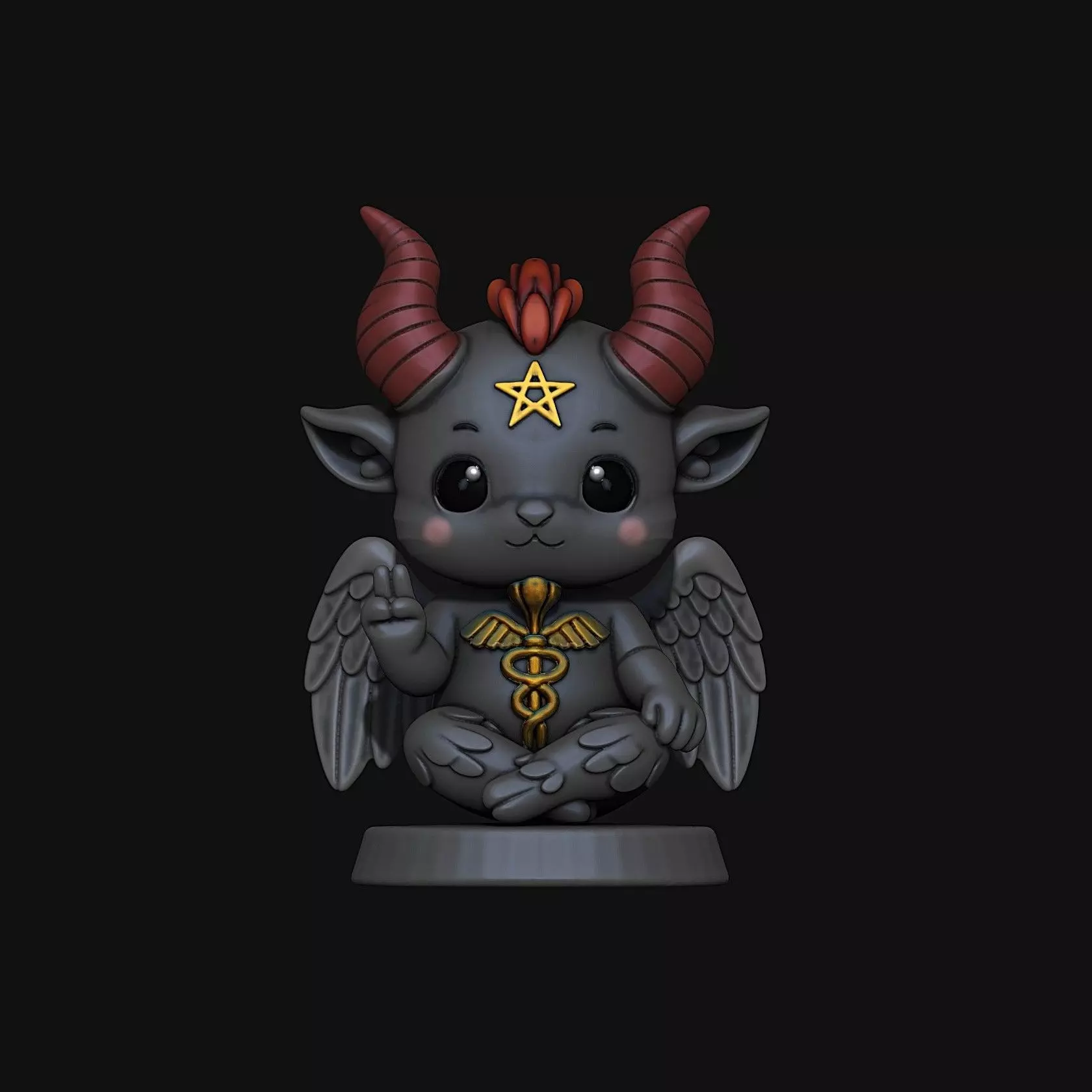 Design ConceptThis figure is designed to combine Baphomet's enigmatic nature with an adorable chibi style. Its soft, rounded features and large eyes create an appealing appearance while retaining iconic elements like the horns and wings.PurposeIdeal as a collectible or decorative piece, this chibi Baphomet is perfect for those who enjoy mythical creatures with an adorable touch.Printing TipsUse PLA or high-quality resin to capture the intricate details of the horns and wings. A layer height of 0.1-0.2 mm is recommended to preserve detail.Assembly InstructionsThe product is delivered as a single, solid print with no assembly required. The product is also available in split and interlocking versions. Supports are recommended.