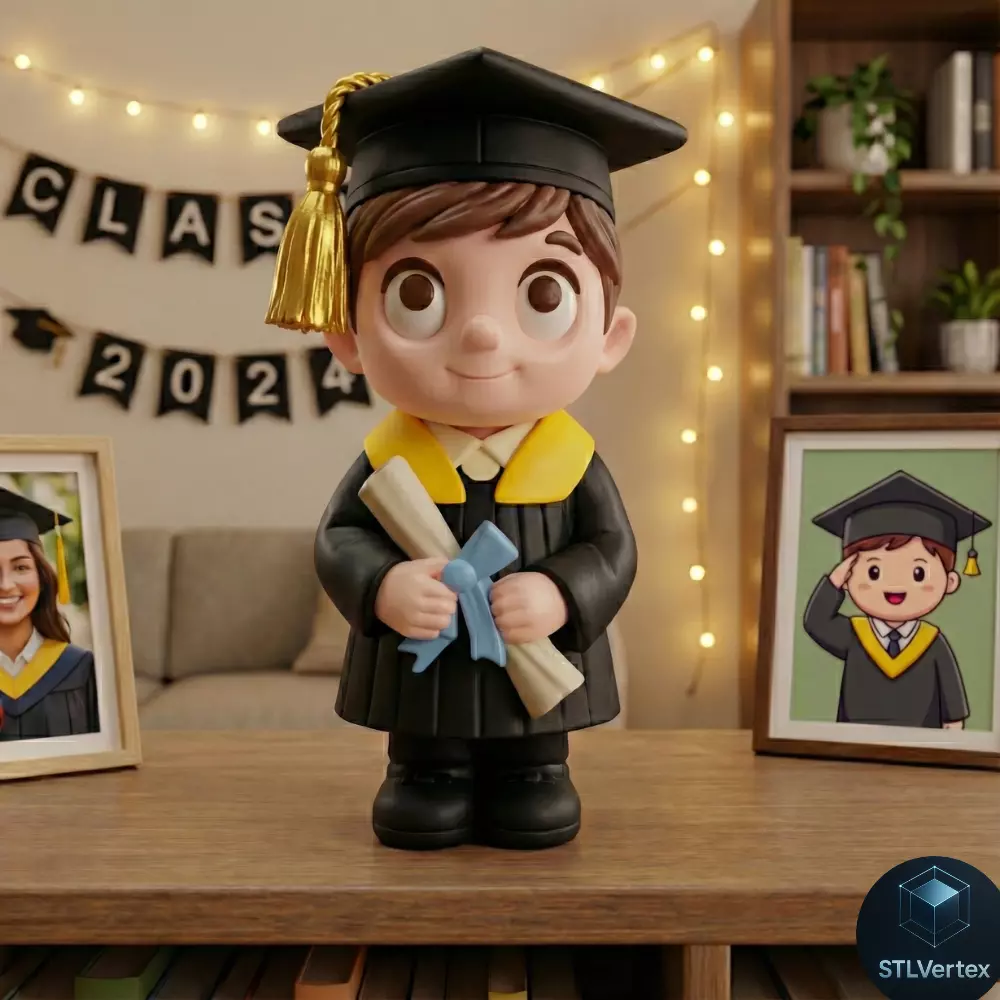 Material sugerido: ANÁLISIS DE PROPÓSITO: Para una terminación premium y detallada en los ojos y la textura de la borla, la Resina Standard es ideal. Si se opta por FDM, el PLA es el material más adecuado debido a su facilidad para manejar los voladizos del birrete y su buena adherencia entre capas.