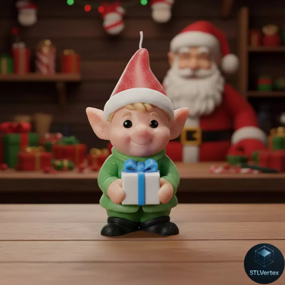 La figura lleva un gorro alto y puntiagudo que se inclina ligeramente hacia un lado. Tiene orejas grandes y redondeadas que sobresalen a los costados. Sostiene con ambas manos una caja cuadrada adornada con un lazo en la parte superior. Sus pies son anchos y su indumentaria incluye un conjunto de camisa, cinturón y pantalón corto. Todo el modelo está construido con detalles simples y formas redondeadas.