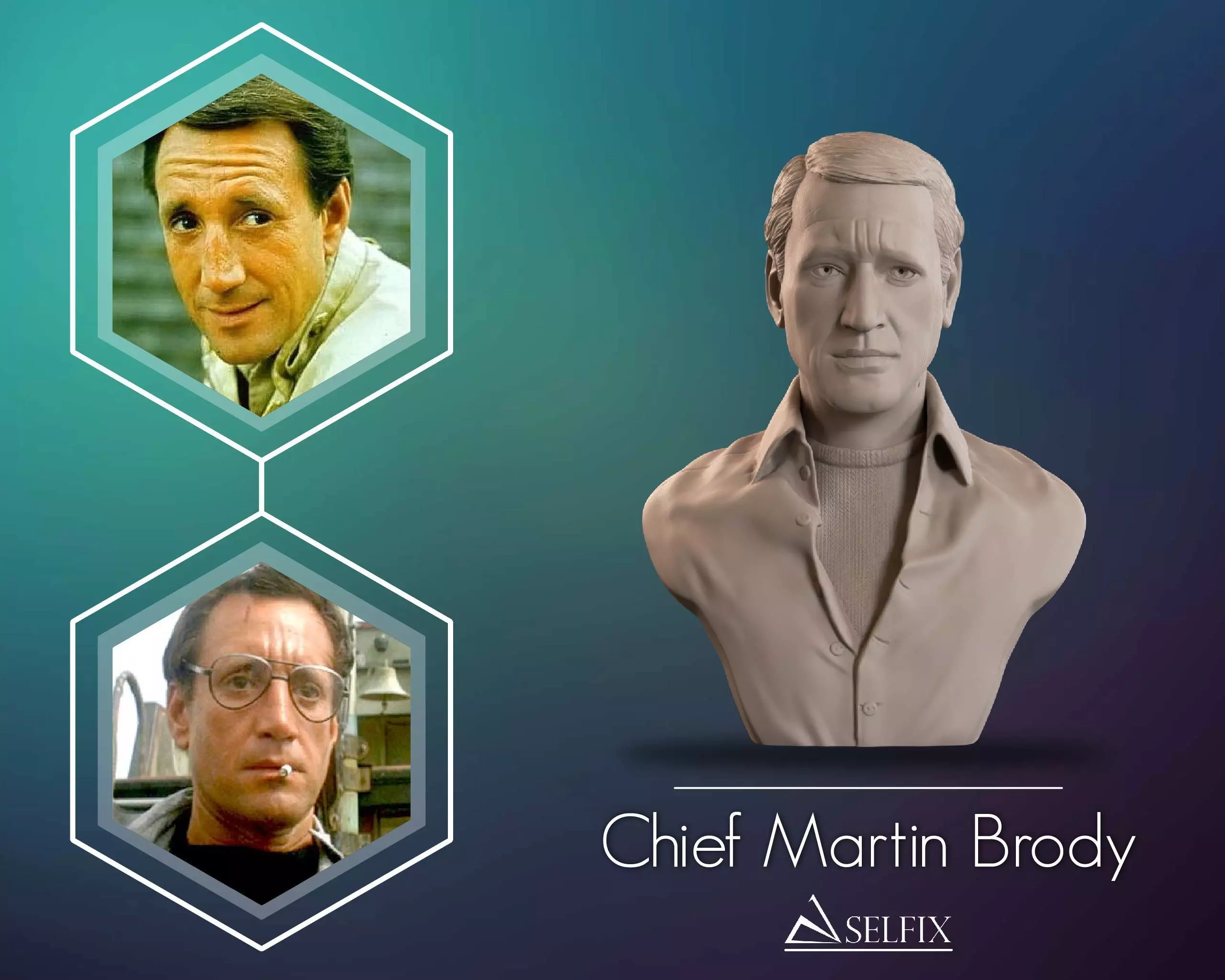 3D printable bust sculpture of Chief Martin Brody, the iconic fictional police chief from the classic thriller film portrayed by :contentReference[oaicite:1]{index=1}. As the determined protector of Amity Island, Brody became a symbol of courage and responsibility, facing extraordinary danger to defend his community in one of the most influential suspense films ever made.